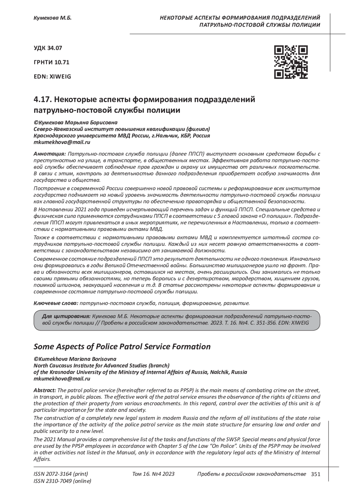 4. Каримова Г.Ю. Исторический аспект становления патрульно-патрульно-постовой службы полиции в России //Modern Science.2022. № 2. С. 200-203.