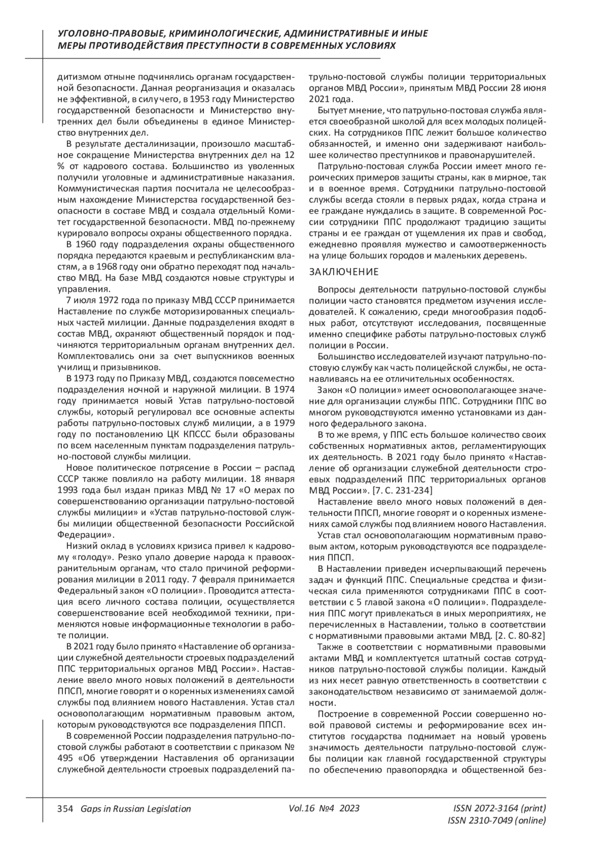 5. Карнаухов О.П. Сравнительный анализ основного нормативного правового акта, регламентирующего деятельность патрульно-постовой службы полиции // Актуальные проблемы борьбы с преступлениями и иными правонарушениями. 2022. № 22. С. 177-179. EDN: FJTQND