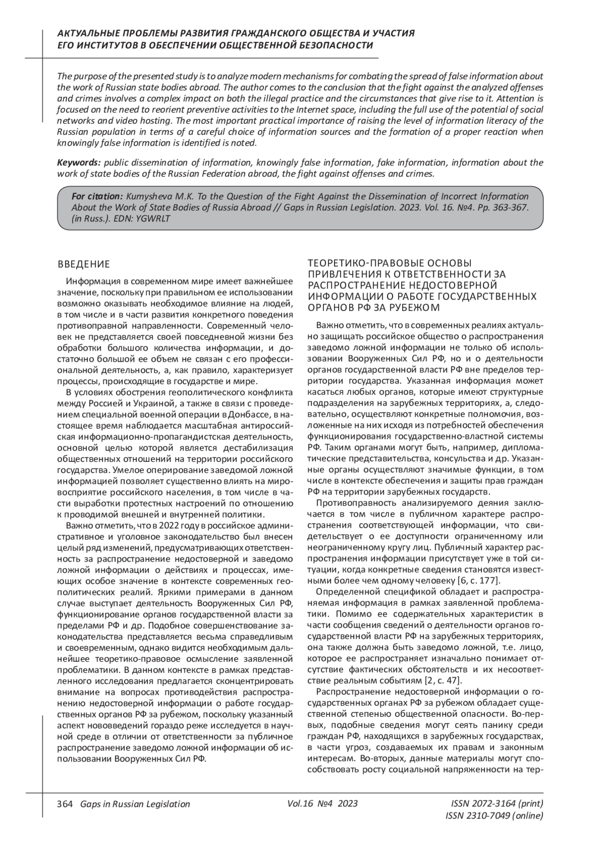 Информационное воздействие в настоящее время позволяет оперативно организовывать общественную реакцию на происходящие государственные и социальные процессы. Указанная тенденция наглядно проявляется в рамках антироссийской информационно-пропагандисткой деятельности, которая весьма активно осуществляется в настоящее время в условиях обострения геополитического конфликта между Россией и Украиной и проведением специальной военной операции. В данном контексте справедливым видится совершенствование отраслевого законодательства в части закрепления ответственности не только за распространение заведомо ложных сведений об использовании Вооруженных Сил РФ, но и о функционировании органов государственной власти РФ на территории зарубежных государств. Учитывая значимость деятельности вышеназванных государственных органов по обеспечению и охране прав и законных интересов граждан РФ за рубежом, подобное противоправное поведение представляет существенную общественную опасность. Целью представленного исследования выступает анализ современных механизмов борьбы с распространением недостоверной информации о работе государственных органов России за рубежом. Автор приходит к выводу о том, что борьба с анализируемыми правонарушениями и преступлениями предполагает комплексное воздействие как на противоправную практику, так и на обстоятельства, ее порождающие. Акцентируется внимание на необходимости переориентации профилактико-предупредительной деятельности на интернет-пространство, в том числе всесторонне использование потенциала социальных сетей и видеохостингов. Отмечается важнейшее практическое значение повышения уровня информационной грамотности российского населения в части тщательного выбора информационных источников и формирования должной реакции при выявлении заведомо ложных сведений.