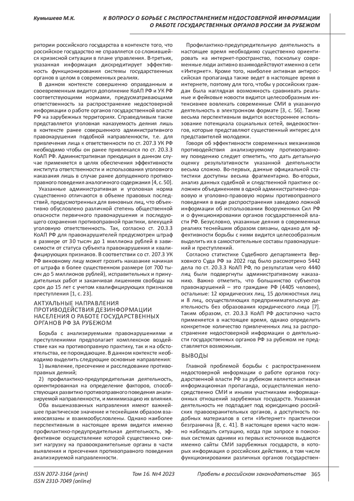 1. Дулькина Л.В. Публичное распространение заведомо ложной информации об использовании Вооруженных Сил РФ и исполнении государственными органами РФ своих полномочий: складывающаяся практика применения ст. 207.3 УК РФ // Вестник Краснодарского университета МВД России. 2022. №3 (57). С. 20-24. EDN: DFHYAK