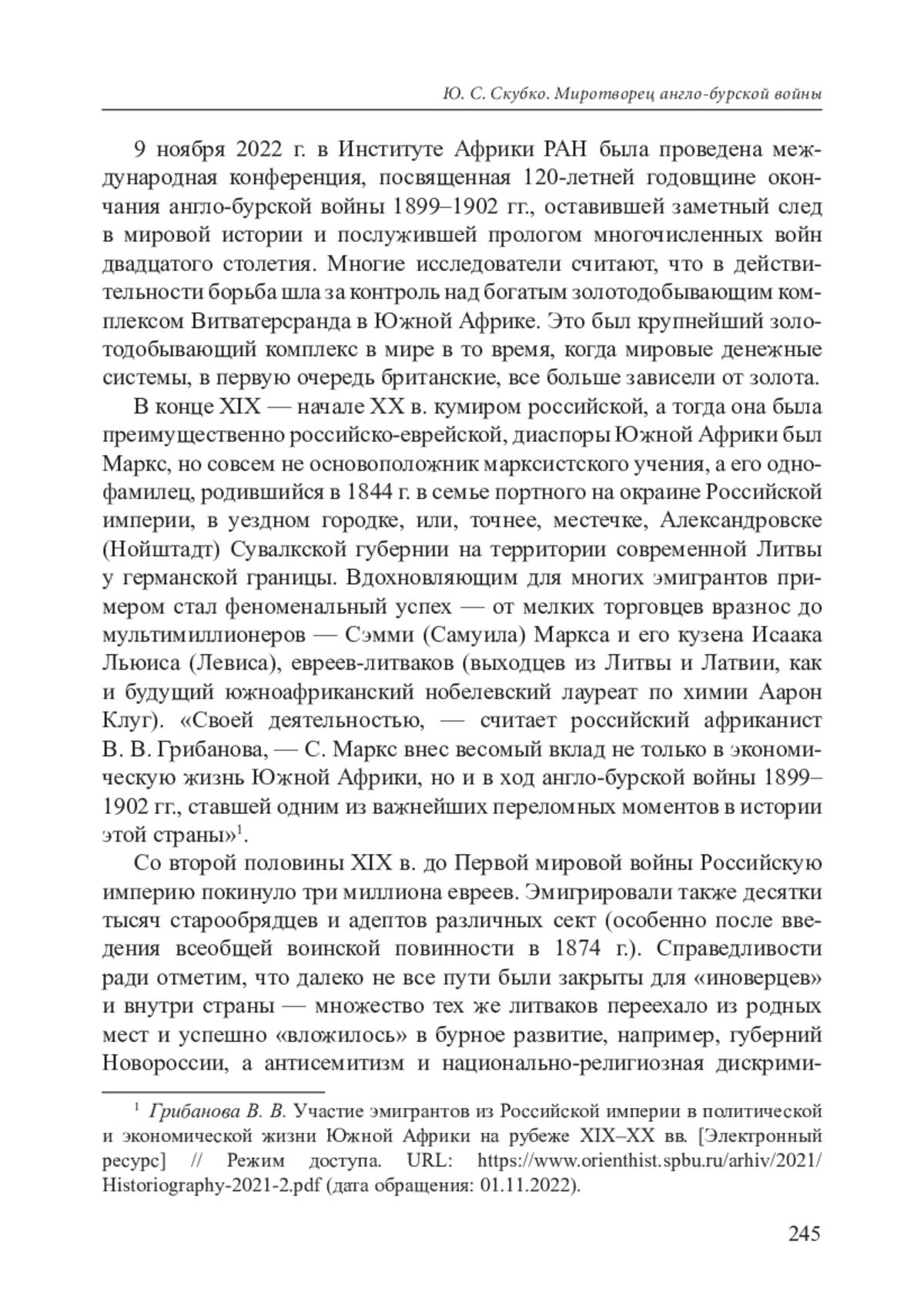 9 ноября 2022 г. в Институте Африки РАН была проведена международная конференция, посвященная 120-летней годовщине окончания англо-бурской войны 1899–1902 гг., оставившей заметный след в мировой истории и послужившей прологом многочисленных войн двадцатого столетия. Многие исследователи считают, что в действительности борьба шла за контроль над богатым золотодобывающим комплексом Витватерсранда в Южной Африке. Это был крупнейший золотодобывающий комплекс в мире в то время, когда мировые денежные системы, в первую очередь британские, все больше зависели от золота.
