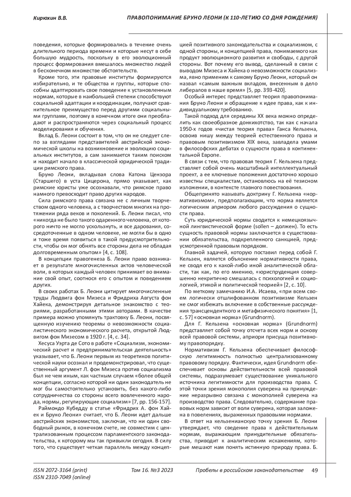 Актуальность темы исследования. Ввиду смены идеологической парадигмы в постсоветский период вопросы методологии теории и истории права обрели новое звучание, вовлекая исследователей в многочисленные дискуссии. В то же время, правовой позитивизм, признавая в качестве правовых только нормы позитивного права, напрямую увязывая последнее с институтом государства, до сих пор доминирует в отечественной юридической науке. Приходится констатировать, что позитивизм фактически игнорирует сложный фундамент под институтом права, который возникает словно из небытия. Методология изучения генезиса права за границами позитивистской парадигмы в отечественном правоведении является не самым сильным козырем. В силу этого автор обращает читателя к творчеству итальянского философа, антифашиста, ученого, юриста Бруно Леони (1913-1967), оказавшего значительное влияние на развитие философских и юридических взглядов XX столетия. Основывая и развивая свою концепцию правопонимания на постулатах римского права, взглядах представителей различных поколений австрийской школы экономической теории, Бруно Леони осуществил одну из самых обоснованных и удачных попыток противостоять доминированию в европейской правовой мысли нормативизма Г. Кельзена. Цель написания исследовательской работы заключается в авторском осмыслении творческого наследия Бруно Леони, определении места его научных идей в юридическом мировоззрении XX века, обращении внимания на продуктивные основы его методологии в изучении права. Основным методом, используемым при написании работы, является диалектический метод познания окружающей действительности. Кроме того, при написании работы автором использовался ряд общих и специальных методов научного познания: анализ, синтез, индукция, дедукция, исторический, сравнительно-правовой, формально-юридические и другие методы научного познания. Выводы, полученные в ходе исследования, позволяют утверждать, что интерес к творческому наследию Бруно Леони будет способствовать дальнейшему осмыслению и развитию научных идей в области юриспруденции, философии и экономики.