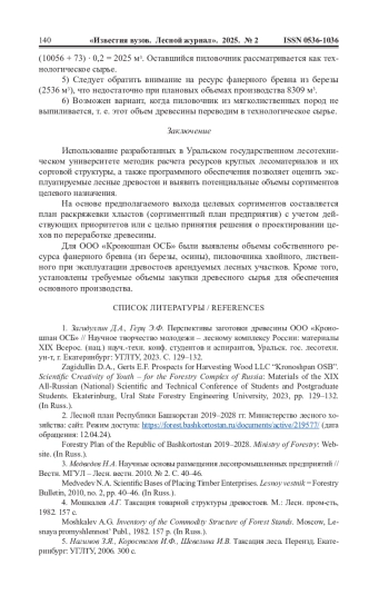 1. Загидуллин Д.А., Герц Э.Ф. Перспективы заготовки древесины ООО “Кроношпан ОСБ” // Научное творчество молодежи - лесному комплексу России: материалы XIX Всерос. (нац.) науч.-техн. конф. студентов и аспирантов, Уральск. гос. лесотехн. ун-т, г. Екатеринбург: УГЛТУ, 2023. С. 129-132. EDN: KLHECA
