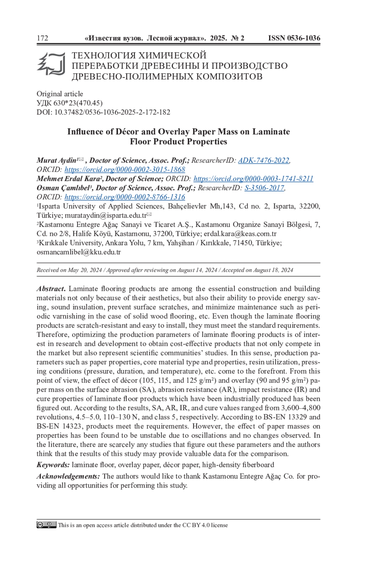 Ламинированные напольные покрытия входят в число базовых строительных материалов не только из-за своей эстетичности, но и благодаря возможности с их помощью обеспечить энергосбережение, звукоизоляцию, предотвратить царапины на поверхности и минимизировать уход, такой как периодическая лакировка в случае с напольными покрытиями из массива дерева и др. Несмотря на то, что ламинированные напольные покрытия устойчивы к царапинам и просты в укладке, они должны соответствовать стандартным требованиям. Поэтому оптимизация параметров производства ламинированных напольных покрытий представляет интерес для научных исследований и разработок, нацеленных на получение экономически эффективной продукции, которая не только конкурентноспособна на рынке, но и репрезентует результаты деятельности научных сообществ. В этом смысле на первый план выходят следующие параметры: свойства бумаги, тип и характеристики материала сердцевины, использование смолы, условия прессования (давление, продолжительность, температура) и т. д. Определено влияние массы декоративной (105, 115 и 125 г/м2) и покровной (90 и 95 г/м2) бумаг на истираемость поверхности, устойчивость к истиранию, ударопрочность и износостойкость ламинатных напольных покрытий, произведенных промышленным способом. Результаты исследования продемонстрировали, что показатели варьировали в пределах 3600-4800 об., 4,5-5,0, 110-130 Н и класса 5 соответственно. Продукция отвечает требованиям стандартов BS-EN 13329 и BS-EN 14323. Однако было обнаружено, что влияние массы бумаги на свойства нестабильно: наблюдались колебания показателей или отсутствие изменений. В литературе почти нет сведений об указанных параметрах, поэтому результаты этой работы могут представлять ценные данные для сравнения.
