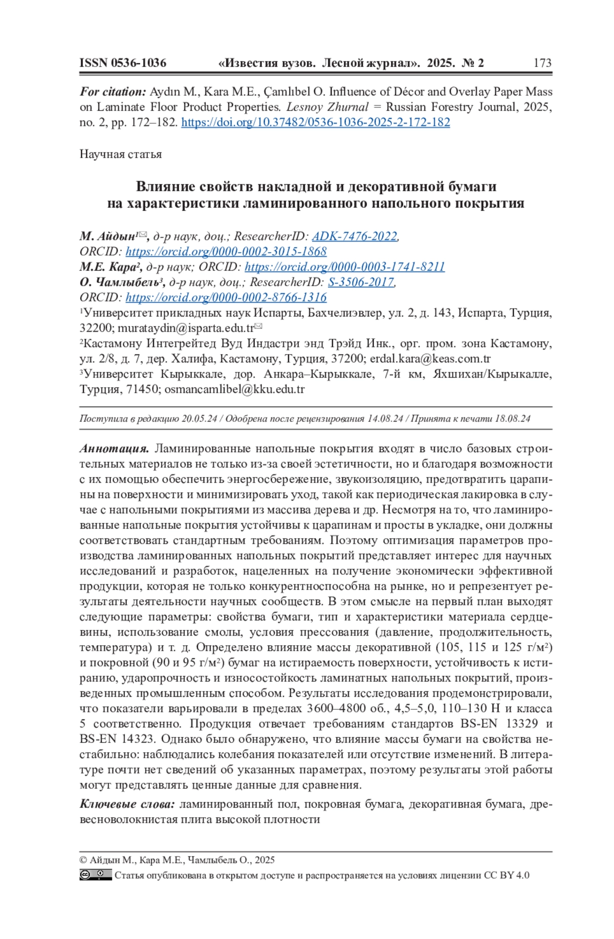 8. İstek A., Özlüsoylu İ., Özel F., Yazıcı H. Problems in Laminate Parquet Applications. Proceedings of the III International Mediterranean Forest and Environment Symposium. Kahramanmaraş Sütçü İmam University, 2019, pp. 633-636.