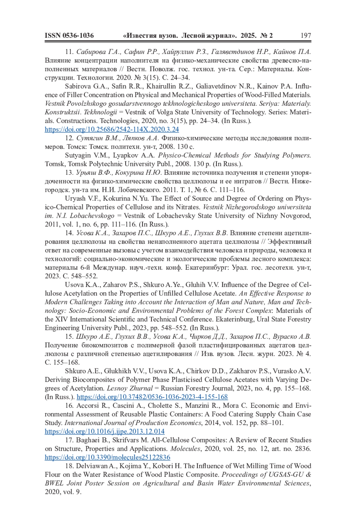 15. Получение биокомпозитов с полимерной фазой пластифицированных ацетатов целлюлозы с различной степенью ацетилирования / А. Е. Шкуро, В. В. Глухих, К. А. Усова [и др.] // Известия высших учебных заведений. Лесной журнал. - 2023. - № 4(394). - С. 155-168. DOI: 10.37482/0536-1036-2023-4-155-168 EDN: YOAYCS