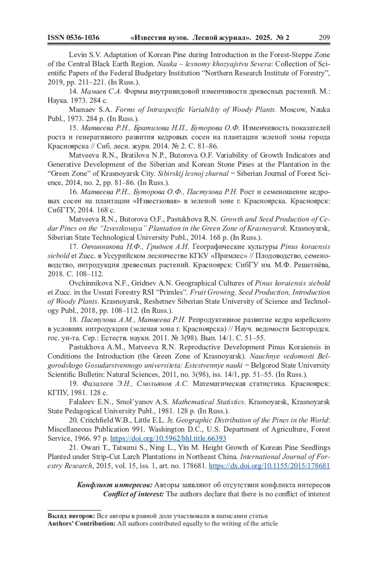 15. Матвеева Р.Н., Братилова Н.П., Буторова О.Ф. Изменчивость показателей роста и генеративного развития кедровых сосен на плантации зеленой зоны города Красноярска // Сиб. лесн. журн. 2014. No 2. С. 81-86. EDN: SMHFWZ