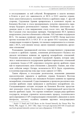 Затянувшийся процесс политического урегулирования в Сирийской Арабской Республике вызвал обеспокоенность в арабских странах. Они действительно озабочены тем, что продолжающийся кризис усиливает позиции Ирана и Турции не только в САР, но и в регионе в целом. Более того, отсутствие политической стабильности в САР угрожает дестабилизации в других странах арабского мира. Яркими примерами тому являются Ливан, Ирак и Йемен.
