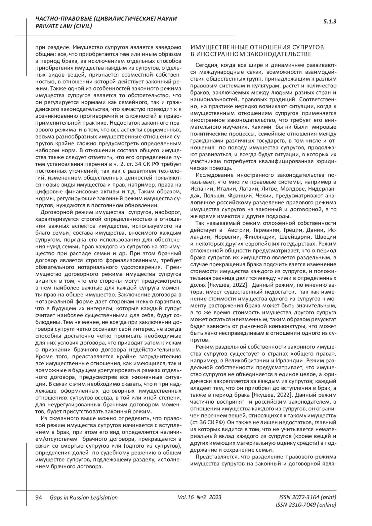13. Якушев П. А. Правовые режимы законного имущества супругов в России и государствах Европы: сравнительно-правовой анализ // Вестник Владимирского юридического института. 2022. № 4(65). С. 154-159. EDN: YUWHGC