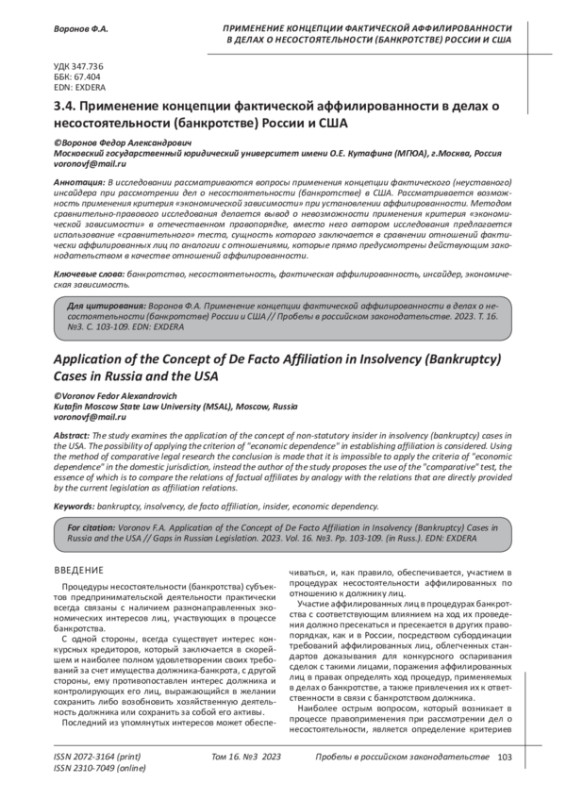 Egorov A.V. Influence of affiliation on bankruptcy. Civilistics, 2021, no. 2. С.67.