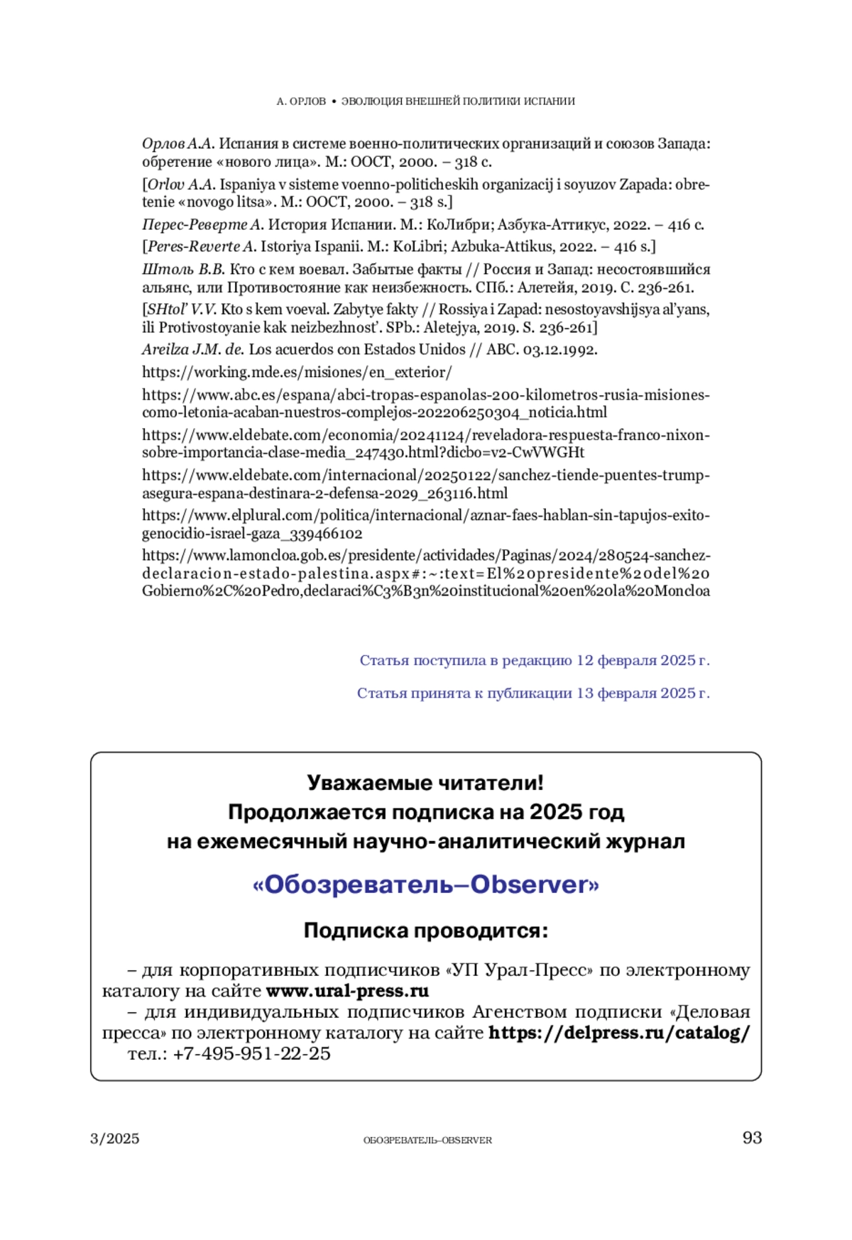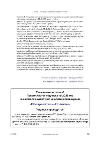 2. Орлов А.А. Испания в системе военно-политических организаций и союзов Запада: обретение «нового лица». М.: ООСТ, 2000. - 318 c. [Orlov A.A. Ispaniya v sisteme voenno-politicheskih organizacij i soyuzov Zapada: obretenie «novogo litsa». M.: OOCT, 2000. - 318 s.]