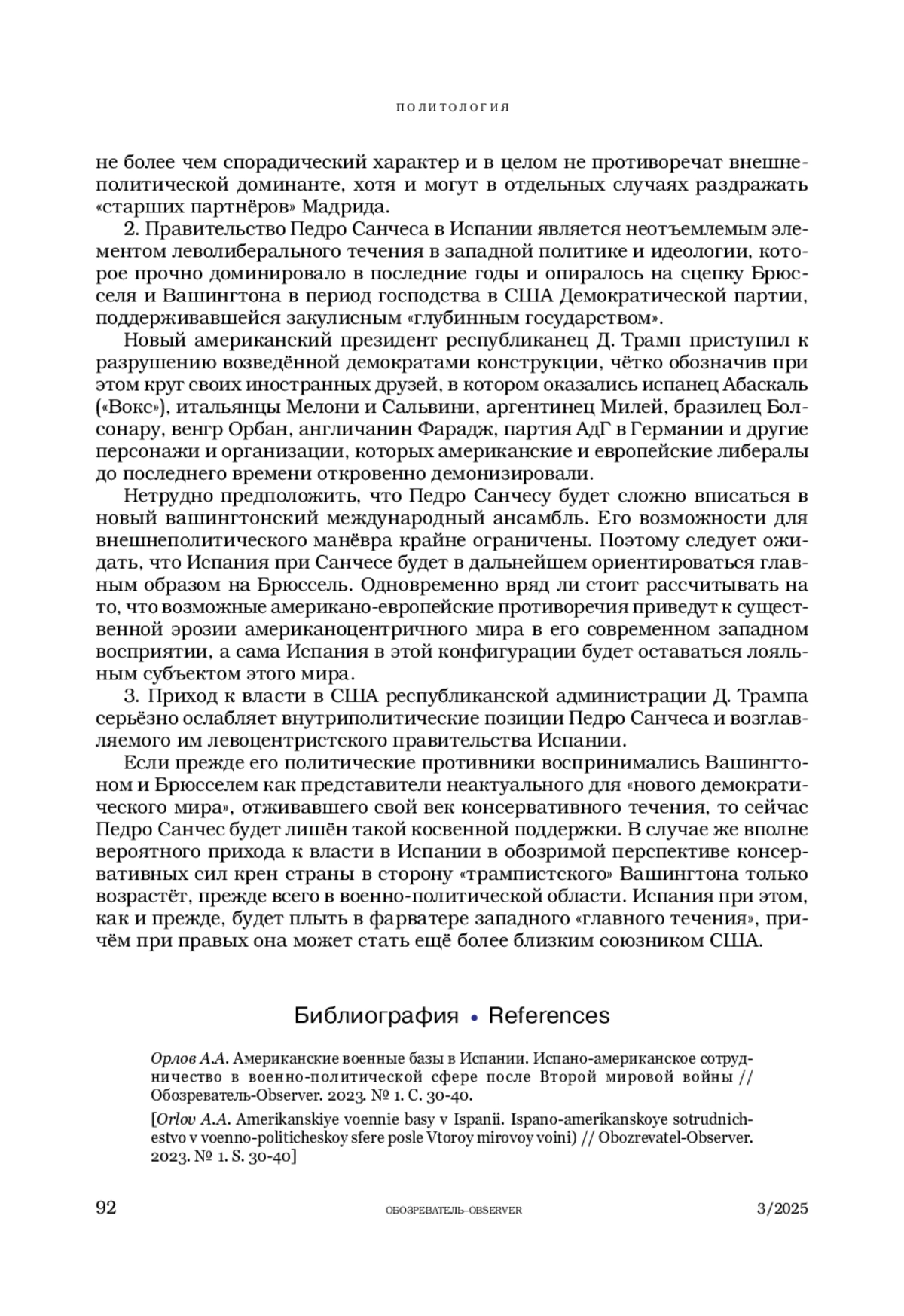 1. Орлов А.А. Американские военные базы в Испании. Испано-американское сотрудничество в военно-политической сфере после Второй мировой войны // Обозреватель-Observer. 2023. № 1. С. 30-40. [Orlov A.A. Amerikanskiye voennie basy v Ispanii. Ispano-amerikanskoye sotrudnichestvo v voenno-politicheskoy sfere posle Vtoroy mirovoy voini) // Obozrevatel-Observer. 2023. № 1. S. 30-40]