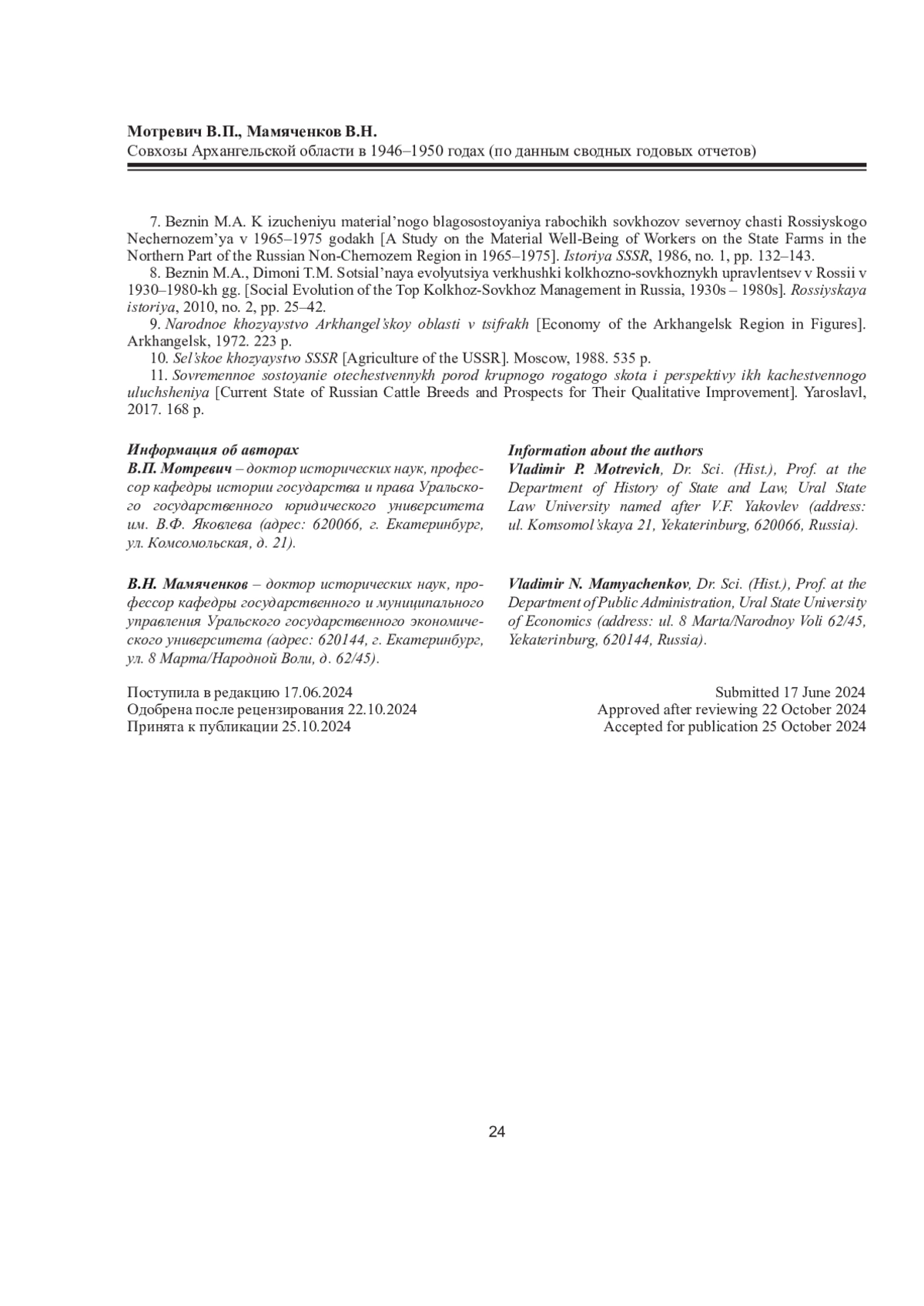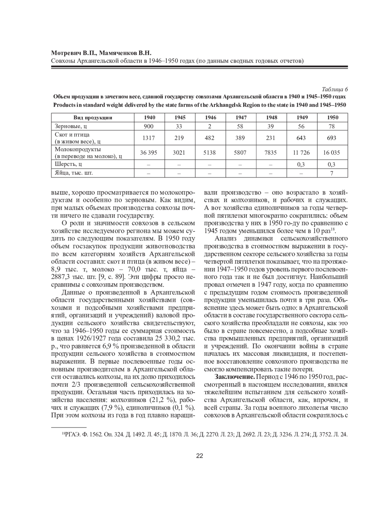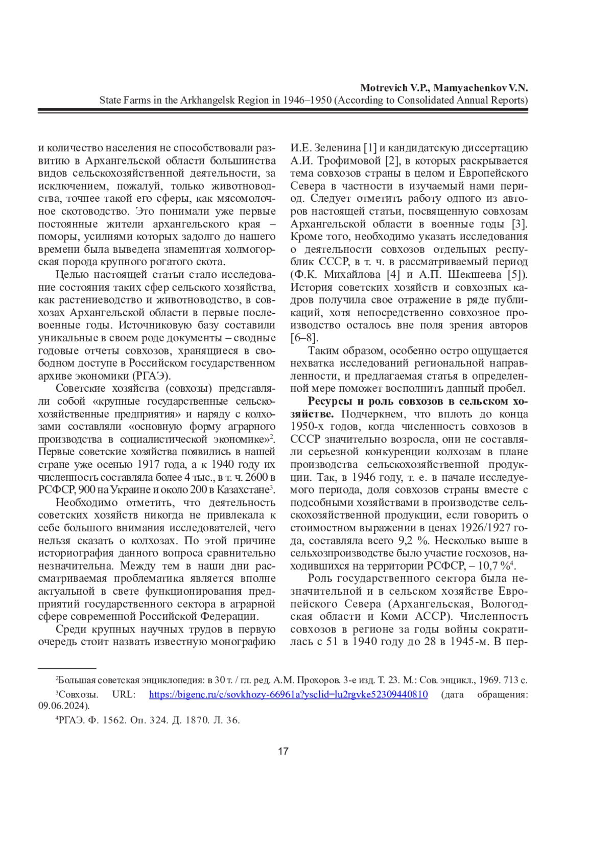 3. Мотревич, В. П. Совхозы Архангельской области в годы Великой Отечественной войны (по данным сводных годовых отчетов) / В. П. Мотревич // Вестник Северного (Арктического) федерального университета. Серия: Гуманитарные и социальные науки. - 2020. - № 5. - С. 26-36. DOI: 10.37482/2227-6564-V046 EDN: KSTUXC
