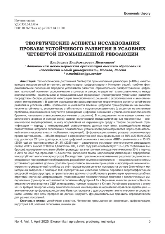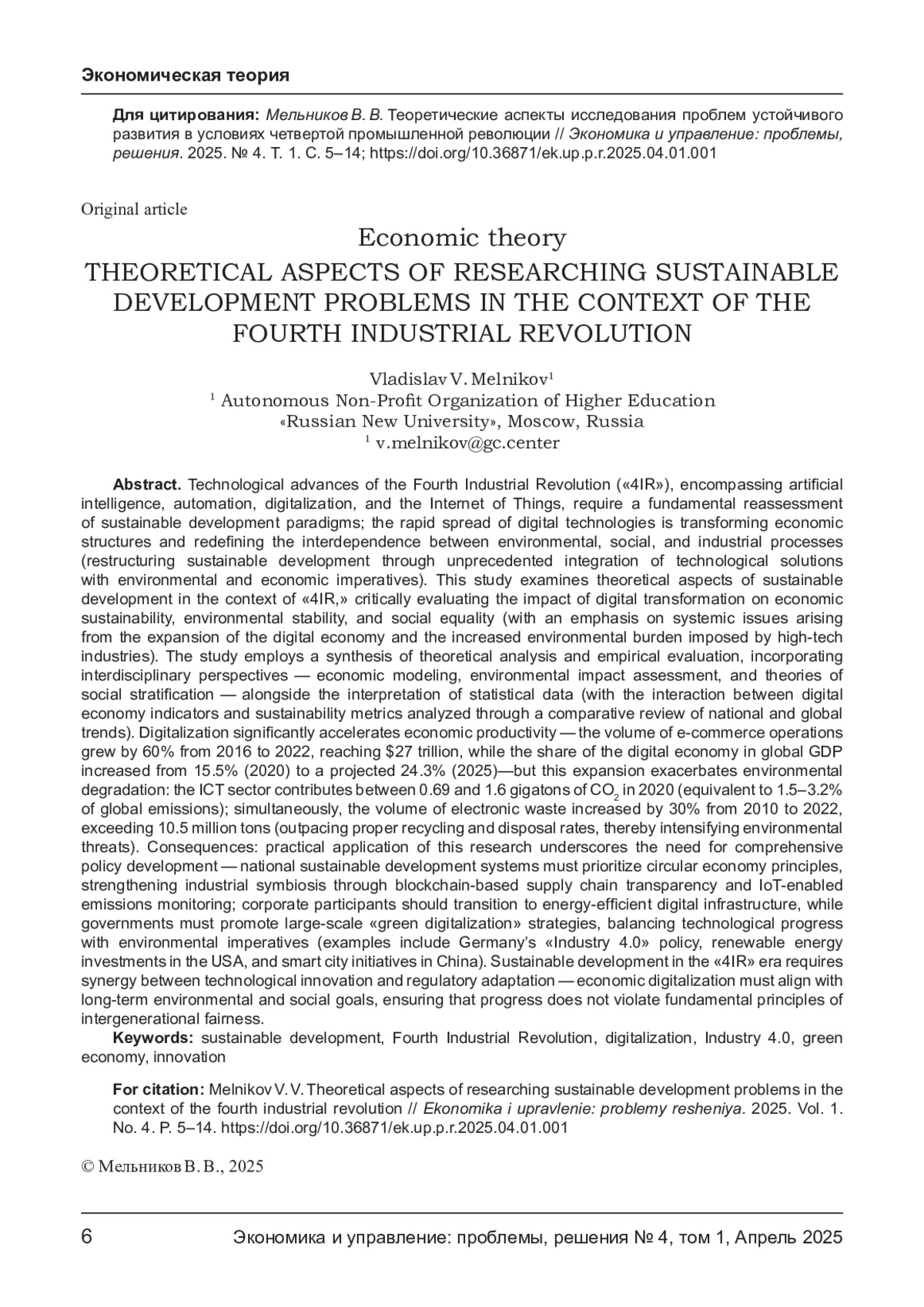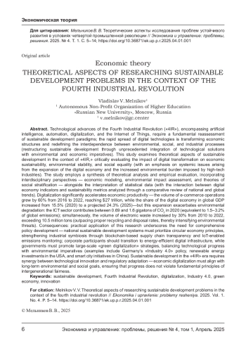 Технологические достижения Четвертой промышленной революции («4IR»), охватывающие искусственный интеллект, автоматизацию, цифровизацию и Интернет вещей, требуют фундаментальной переоценки парадигм устойчивого развития; стремительное распространение цифровых технологий изменяет экономические структуры и заново определяет взаимозависимость между экологическими, социальными и промышленными процессами (перестраивая устойчивое развитие посредством беспрецедентной интеграции технологических решений с экологическими и экономическими императивами). В данном исследовании рассматриваются теоретические аспекты устойчивого развития в условиях «4IR», критически оценивается влияние цифровой трансформации на экономическую устойчивость, экологическую стабильность и социальное равенство (с акцентом на системные проблемы, возникающие в результате расширения цифровой экономики и увеличения экологического бремени, налагаемого высокотехнологичными отраслями). В исследовании использован синтез теоретического анализа и эмпирической оценки, включающий междисциплинарные перспективы - экономическое моделирование, оценку воздействия на окружающую среду и теории социальной стратификации - наряду с интерпретацией статистических данных (при этом, взаимодействие между показателями цифровой экономики и показателями устойчивости рассматривается через сравнительный анализ национальных и глобальных тенденций). Цифровизация заметно ускоряет экономическую производительность - объём операций в сфере электронной коммерции вырос на 60% с 2016 по 2022 год, достигнув 27 трлн долларов, а доля цифровой экономики в мировом «ВВП» увеличилась с 15,5% (2020 год) до прогнозируемых 24,3% (2025 год) - расширение усиливает экологическую деградацию: сектор «ИКТ» вносит от 0.69 и 1,6 гигатонн CO2 в 2020 году (что соответствует 1,5-3,2% глобальных выбросов); одновременно с этим объём производства электронных отходов увеличился на 30% в период с 2010 по 2022 год, превысив 10,5 млн тонн (опережая темпы надлежащей утилизации и переработки, что усугубляет экологическую угрозу). Последствия: практическое применение результатов данного исследования подчеркивает необходимость разработки комплексной политики - национальные системы устойчивого развития должны уделять приоритетное внимание принципам «циркулярной экономики», укрепляя промышленный симбиоз за счёт прозрачности цепочки поставок на основе блокчейна и мониторинга выбросов с помощью IoT; корпоративные участники должны перейти к энергоэффективной цифровой инфраструктуре, а правительства должны способствовать реализации крупномасштабных стратегий «зеленой цифровизации», уравновешивая технологический прогресс с экологическими императивами (примером чего является политика «Индустрии 4.0» в Германии, инвестиции в возобновляемые источники энергии в США и инициативы «умных городов» в Китае). Устойчивое развитие в эпоху «4IR» требует синергии между технологическими инновациями и нормативно- правовой адаптацией - экономическая цифровизация должна быть согласована с долгосрочными экологическими и социальными целями, при этом прогресс не должен нарушать фундаментальные принципы справедливости для разных поколений.