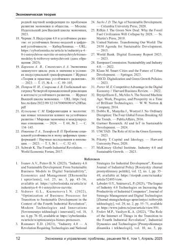 1. Иванов А. В., Петров Б. Н. Индустрия 4.0 и устойчивое развитие: от устойчивых бизнес- моделей к цифровой устойчивости // Экономика и управление. - 2023. - Т. 25, № 3. - С. 45-56. - URL: https://cyberleninka.ru/article/n/industriya-4-0-i-ustoychivoe-razvitie.