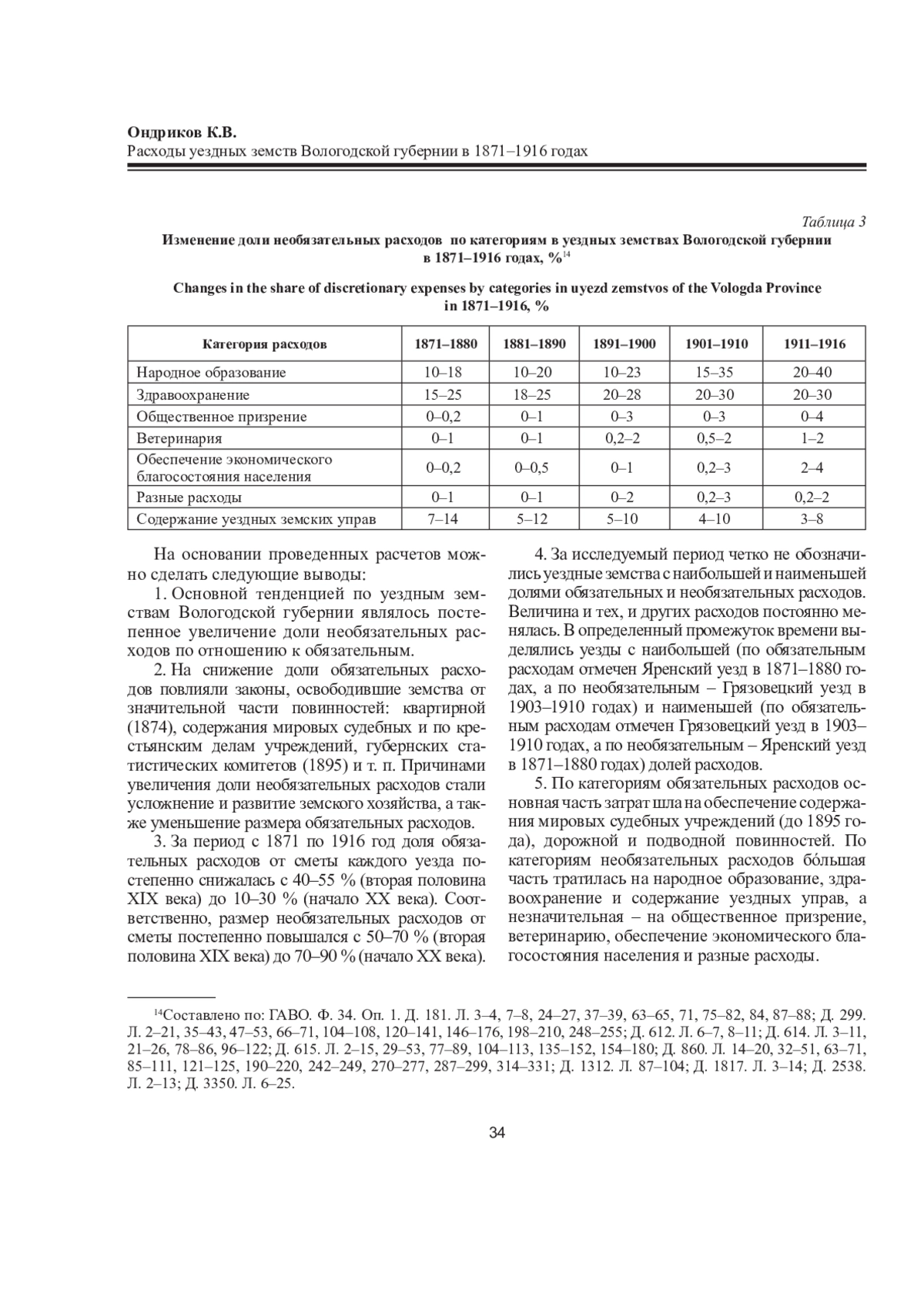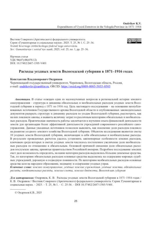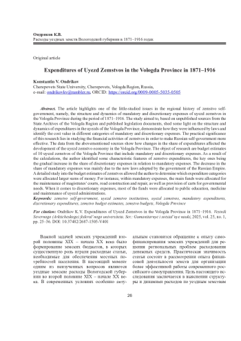 В статье освещен один из малоизученных вопросов в региональной истории земского самоуправления - структура и динамика обязательных и необязательных расходов уездных земств Вологодской губернии в период с 1871 по 1916 год. Цель настоящего исследования - на основании неопубликованных источников Государственного архива Вологодской области и опубликованных законодательных документов раскрыть структуру и динамику расходов по уездам Вологодской губернии, рассмотреть, как на них повлияли законы, и выявить величину затрат по различным категориям обязательных и необязательных расходов. Практическая значимость работы заключается в изучении опыта финансовой деятельности земств для организации более эффективной деятельности учреждений современного российского самоуправления. Данные указанных источников позволили выяснить, как изменение доли расходов повлияло на развитие уездного земского хозяйства Вологодской губернии. Объектом исследования являются сметы 10 уездных земств Вологодской губернии, включающие в себя обязательные и необязательные расходы. В результате проведенных расчетов удалось установить закономерные особенности земских расходов, ключевым среди которых в сметах уездных земств числилось постепенное увеличение доли необязательных расходов по отношению к обязательным. Основной причиной снижения доли обязательных расходов послужили законы, принятые правительством Российской империи. Подробное исследование земских смет дало возможность определить, на какие категории расходов выделялись большие денежные средства. Так, по категориям обязательных расходов основные средства выделялись на содержание мировых судебных учреждений, дорожную и подводную повинности. По категориям необязательных расходов основные средства шли на народное образование, медицину и содержание уездных управ.