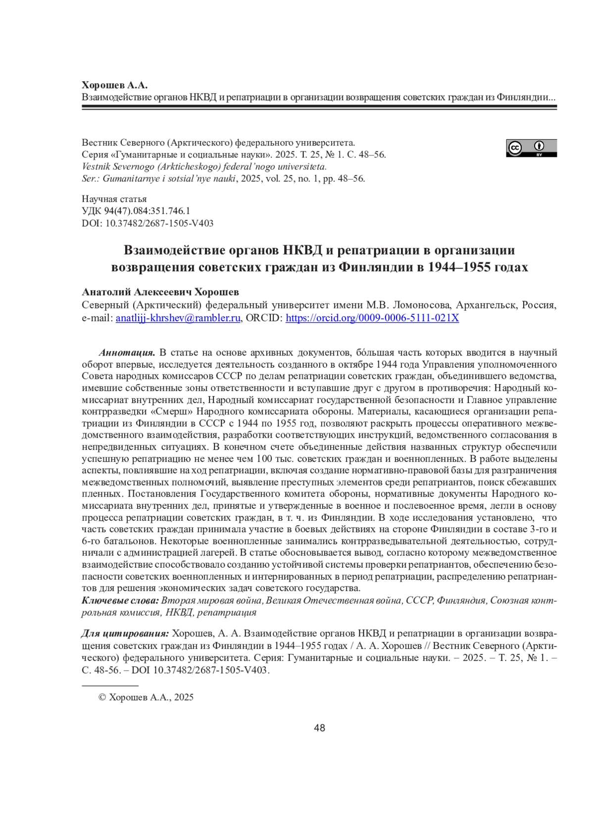 В статье на основе архивных документов, бóльшая часть которых вводится в научный оборот впервые, исследуется деятельность созданного в октябре 1944 года Управления уполномоченного Совета народных комиссаров СССР по делам репатриации советских граждан, объединившего ведомства, имевшие собственные зоны ответственности и вступавшие друг с другом в противоречия: Народный комиссариат внутренних дел, Народный комиссариат государственной безопасности и Главное управление контрразведки «Смерш» Народного комиссариата обороны. Материалы, касающиеся организации репатриации из Финляндии в СССР с 1944 по 1955 год, позволяют раскрыть процессы оперативного межведомственного взаимодействия, разработки соответствующих инструкций, ведомственного согласования в непредвиденных ситуациях. В конечном счете объединенные действия названных структур обеспечили успешную репатриацию не менее чем 100 тыс. советских граждан и военнопленных. В работе выделены аспекты, повлиявшие на ход репатриации, включая создание нормативно-правовой базы для разграничения межведомственных полномочий, выявление преступных элементов среди репатриантов, поиск сбежавших пленных. Постановления Государственного комитета обороны, нормативные документы Народного комиссариата внутренних дел, принятые и утвержденные в военное и послевоенное время, легли в основу процесса репатриации советских граждан, в т. ч. из Финляндии. В ходе исследования установлено, что часть советских граждан принимала участие в боевых действиях на стороне Финляндии в составе 3-го и 6-го батальонов. Некоторые военнопленные занимались контрразведывательной деятельностью, сотрудничали с администрацией лагерей. В статье обосновывается вывод, согласно которому межведомственное взаимодействие способствовало созданию устойчивой системы проверки репатриантов, обеспечению безопасности советских военнопленных и интернированных в период репатриации, распределению репатриантов для решения экономических задач советского государства.
