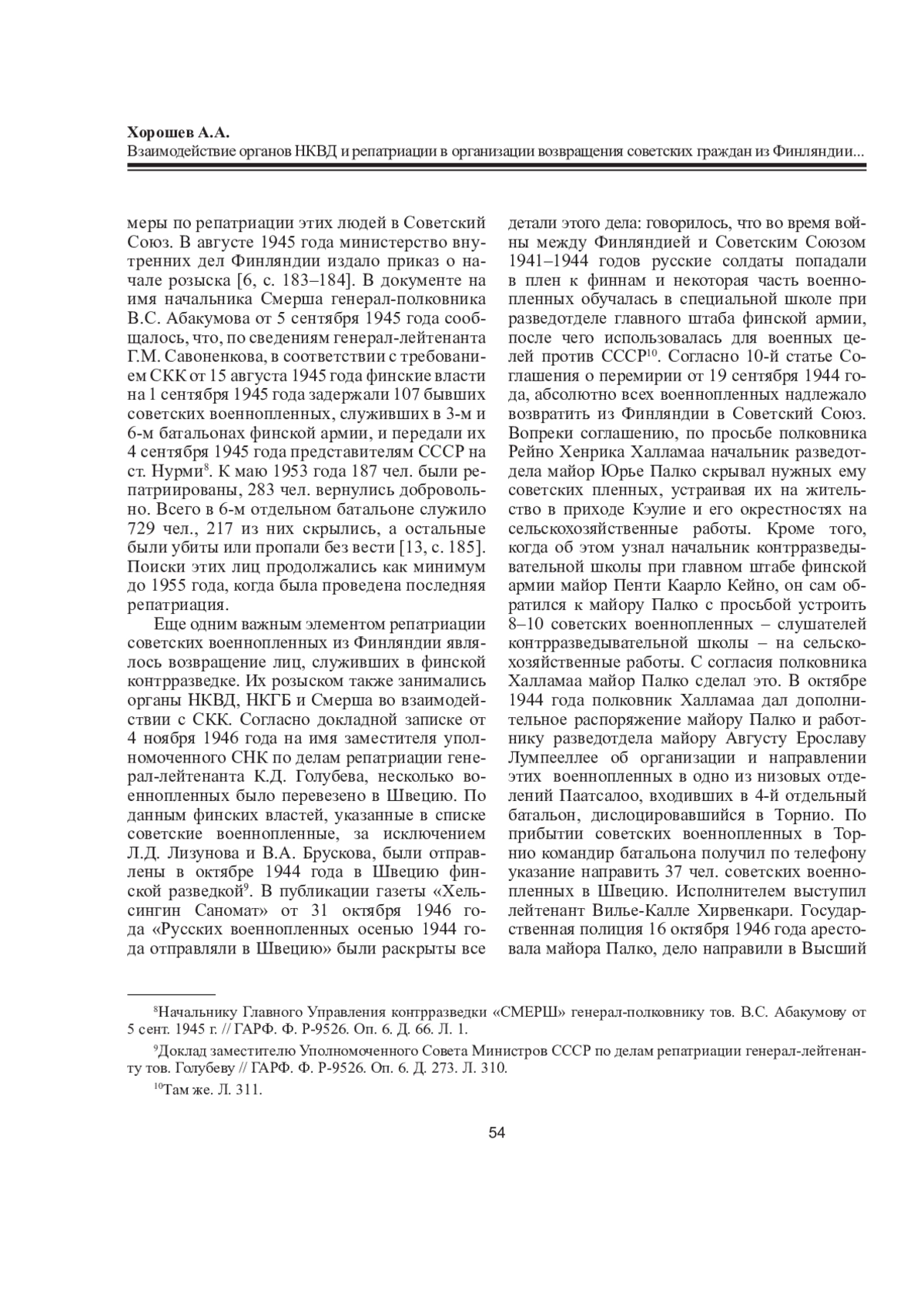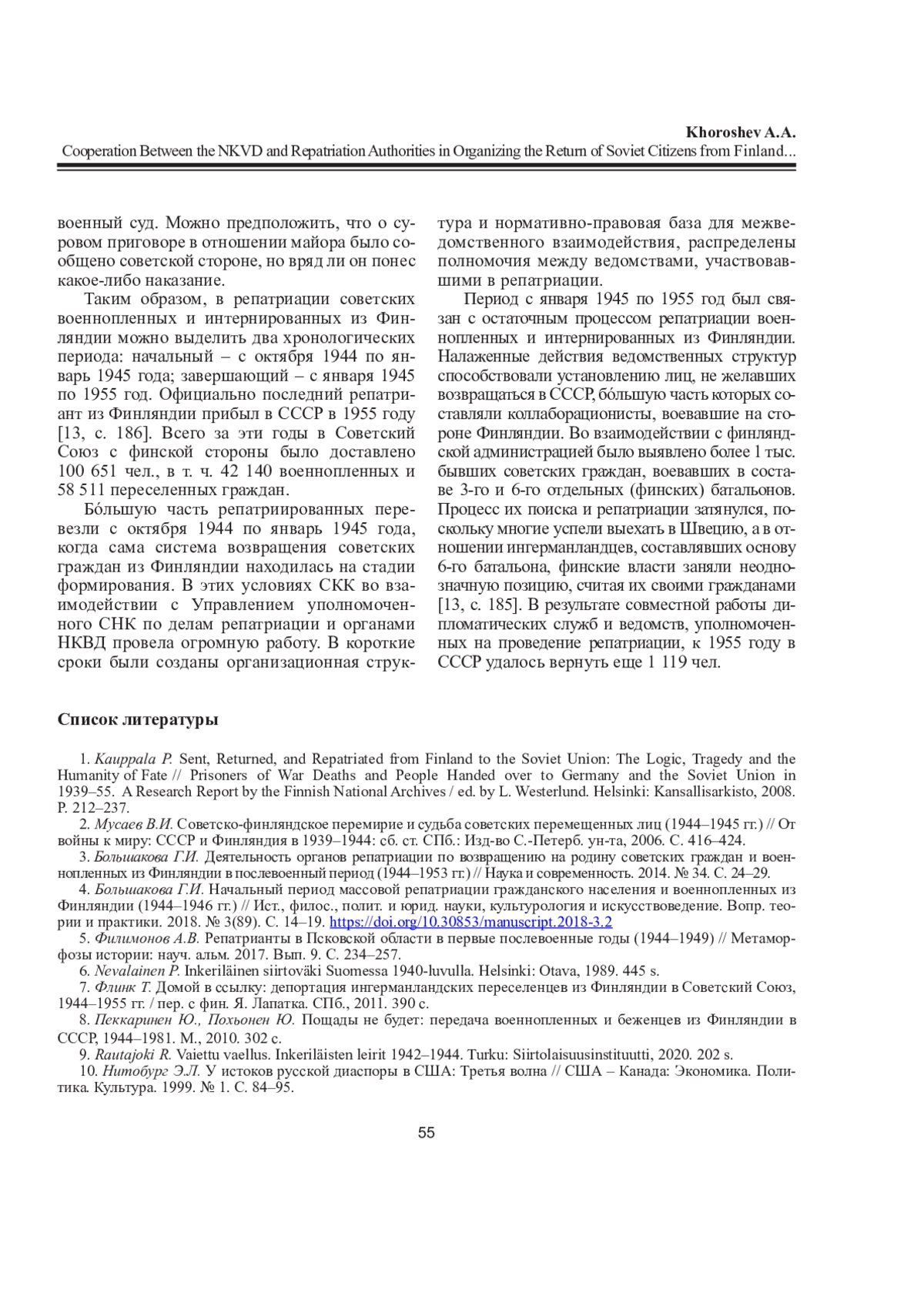 1. Kauppala P. Sent, Returned, and Repatriated from Finland to the Soviet Union: The Logic, Tragedy and the Humanity of Fate // Prisoners of War Deaths and People Handed over to Germany and the Soviet Union in 1939-55. A Research Report by the Finnish National Archives / ed. by L. Westerlund. Helsinki: Kansallisarkisto, 2008. P. 212-237.