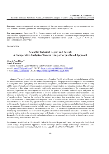 Статья посвящена анализу метаструктур современного англоязычного научно-технического дискурса на материале таких жанров, как научно-технический отчет и патент. Цель исследования - сопоставление метаструктур названных жанров с акцентом на такие функции, как диалогизация, линейная последовательность, подтверждение сказанного визуальным рядом, оценка, комментарий, толкование, привлечение внимания. Актуальность определяется необходимостью диверсификации метаструктурных свойств указанных жанров. Научная новизна исследования состоит в том, что в его рамках впервые осуществляется сравнительно-сопоставительный анализ метаструктур таких дискурсивных жанров, как научно-технический отчет и патент, посредством корпус-менеджера AntConc для установления функциональных характеристик метаструктур, что позволяет рассмотреть способы построения научно-технического дискурса с акцентом на категорию метадискурсивности. По результатам сравнительно-сопоставительного анализа делаются выводы о степени встречаемости в жанрах метаструктур и уровне метадискурсивности жанров. Помимо этого, описываются единые для обоих жанров функции метаструктур и функции, присущие только жанру научно-технического отчета, отмечаются самые популярные и менее употребляемые функции метаструктур в характеризуемых жанрах и предлагаются возможные причины такой частотности. Материал исследования включает тексты современных научно-технических отчетов и патентов, представленных корпусами объемом 360 тыс. слов каждый. Теоретическая значимость статьи состоит в диверсификации метаструктур и способов их употребления в жанрах англоязычного научно-технического дискурса. Практическая ценность связана с применением полученных результатов при самостоятельном составлении англоязычных текстов, относящихся к жанрам научно-технического отчета и патента, с целью построения успешной научной коммуникации.