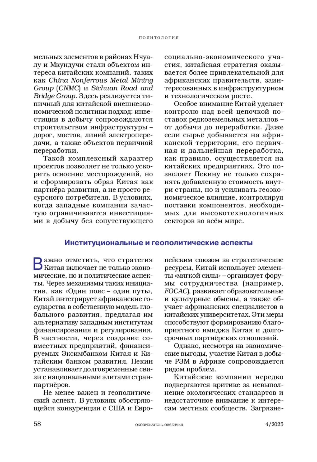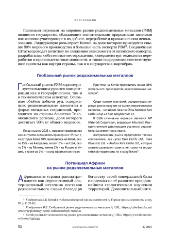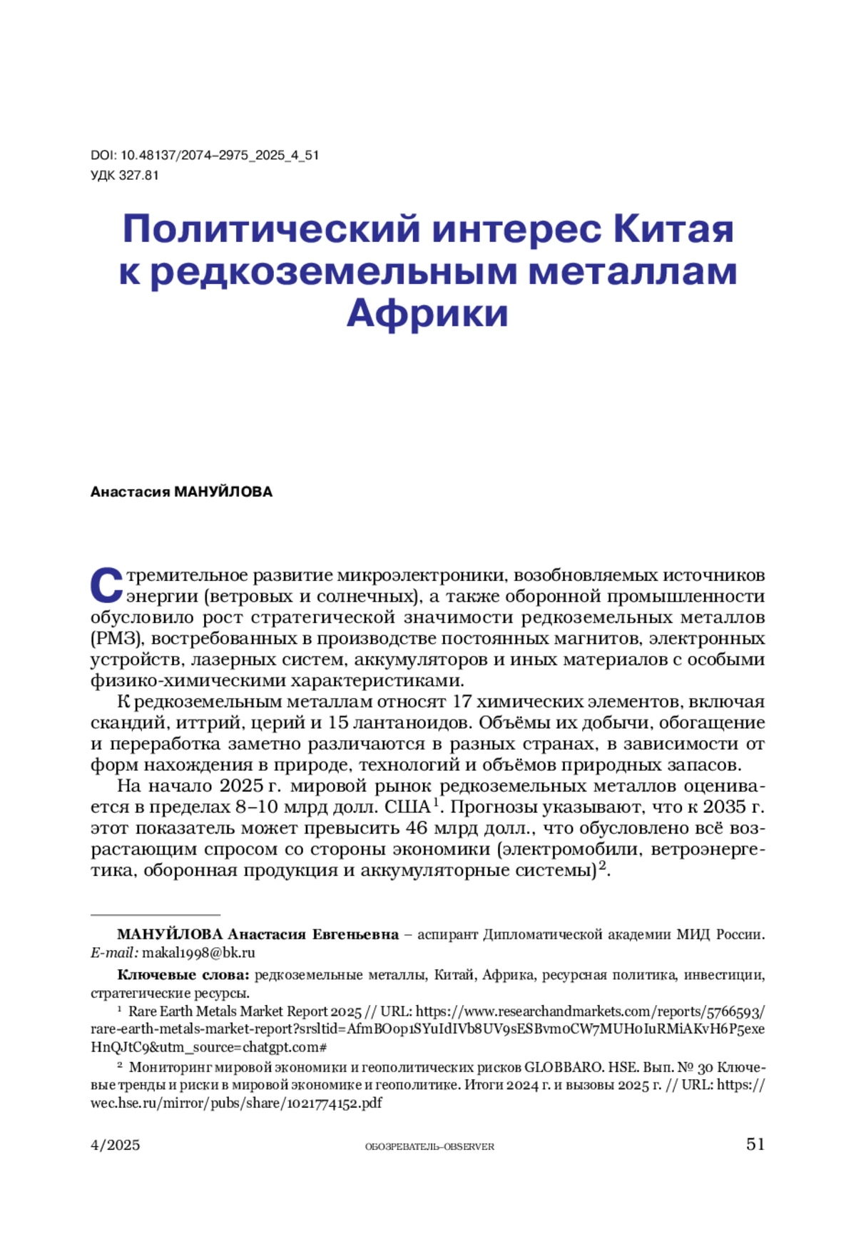 В статье рассмотрена политика Китая по редкоземельным металлам в Африке как элемент его глобальной стратегии обеспечения доступа к критически важным ресурсам. Анализируются значимость редкоземельных металлов для высокотехнологичных отраслей, инвестиционные механизмы КНР, модель «ресурсы в обмен на развитие» и взаимодействие с африканскими государствами.