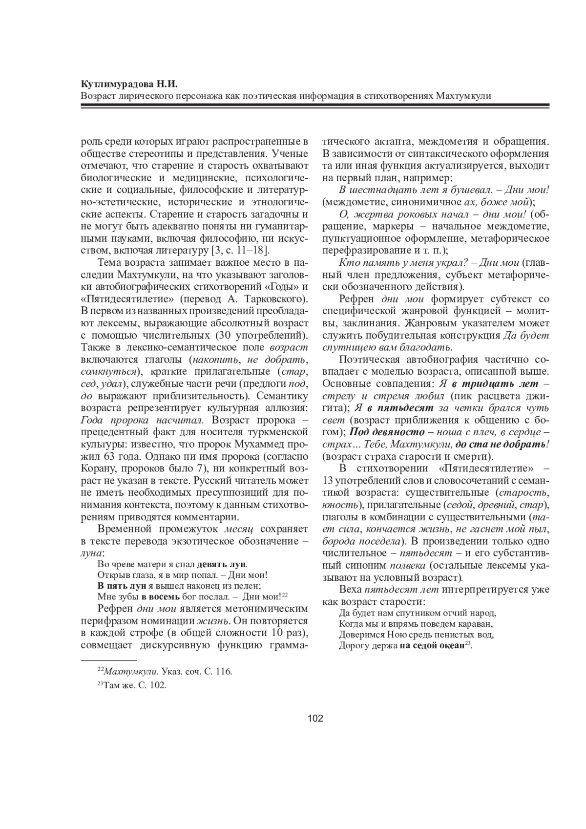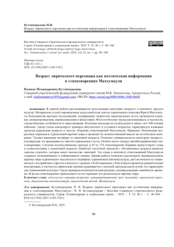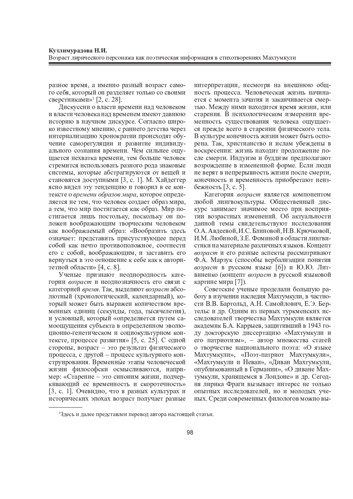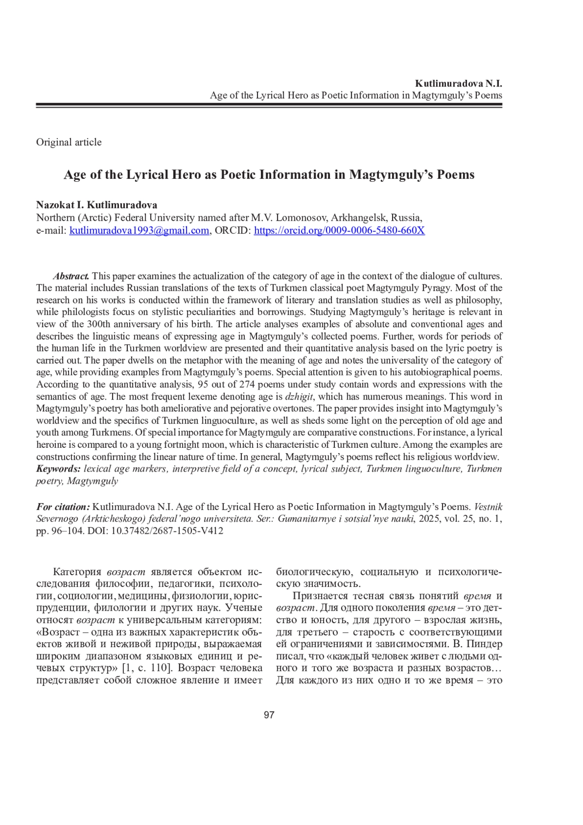 В данной работе рассматривается актуализация категории «возраст» в контексте диалога культур. Материалом служат переведенные на русский язык тексты туркменского классика Фраги Махтумкули. Большинство научных исследований, посвященных творчеству национального поэта, проводится в рамках литературоведения, переводоведения и философии. Филологические труды рассматривают, в частности, стилистические особенности и заимствования. Изучение наследия поэта актуально в связи с его 300-летним юбилеем. Автор статьи анализирует примеры абсолютного и условного возрастов, характеризует языковые средства выражения возраста в текстах сборника стихотворений Махтумкули. Приводит обозначения возрастных периодов в туркменской картине мира и проводит их количественный анализ на поэтическом материале. Уделяет внимание метафоре со значением возраста. Отмечает универсальность категории «возраст», подтверждая это примерами из текстов туркменского поэта. Особое место отводит автобиографическим стихотворениям. Согласно количественному анализу, в 95 из 274 стихотворений сборника присутствуют слова и словосочетания с семантикой возраста. Наиболее частотной лексемой с обозначением возраста является лексема «джигит», которая имеет множество значений. Это слово в контексте стихотворений Махтумкули содержит мелиоративную и пейоративную оценки. Данная работа позволяет рассмотреть индивидуальную картину мира туркменского мыслителя и специфику туркменской лингвокультуры, дает возможность ознакомиться с восприятием старости и юности у туркмен. Особо важными у Махтумкули являются сравнительные конструкции, в частности лирическая героиня сравнивается с молодой двухнедельной луной, что характерно для туркменской культуры. Среди примеров встречаются конструкции, подтверждающие линейность времени. В целом стихотворения туркменского поэта отражают его религиозную картину мира.