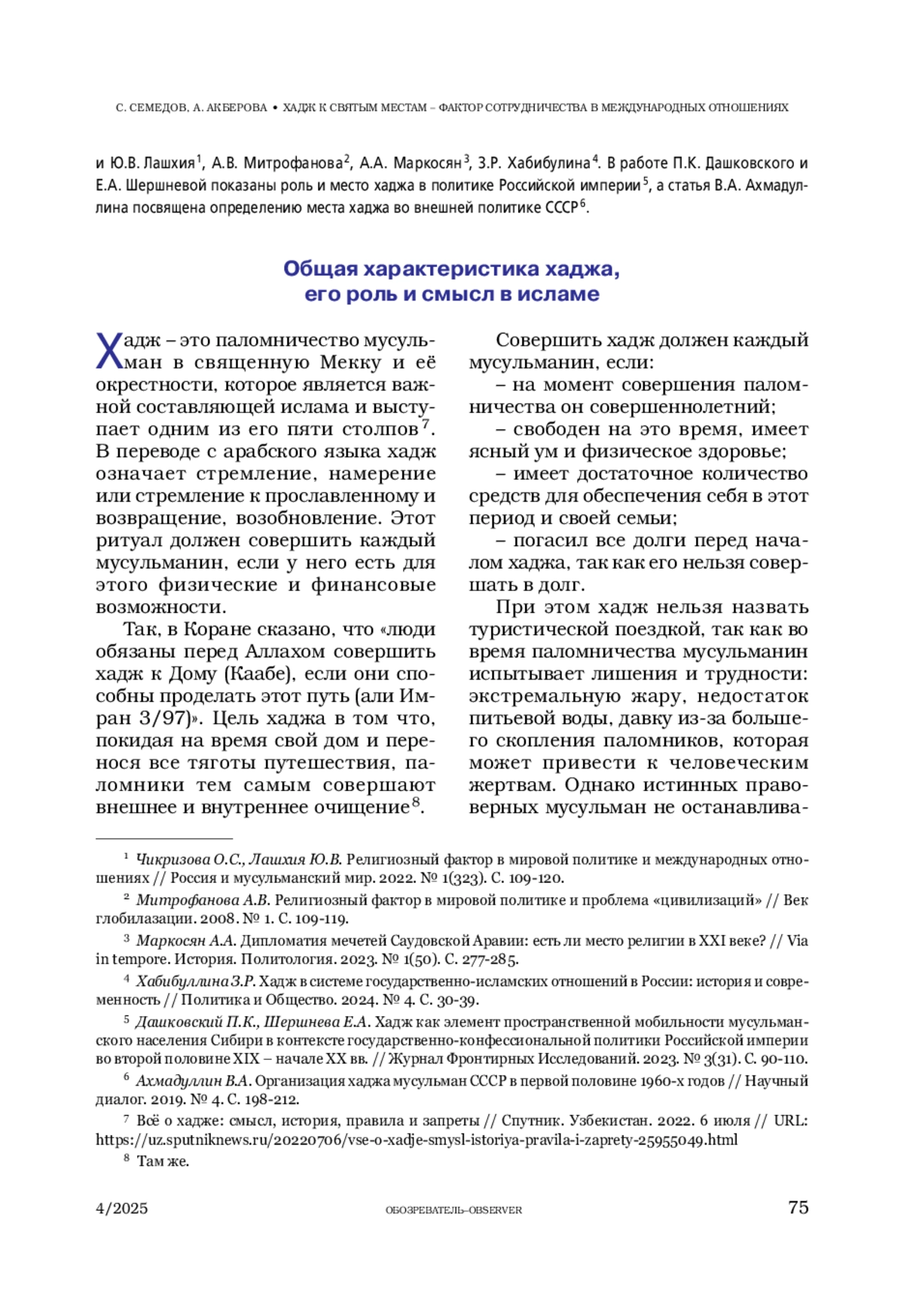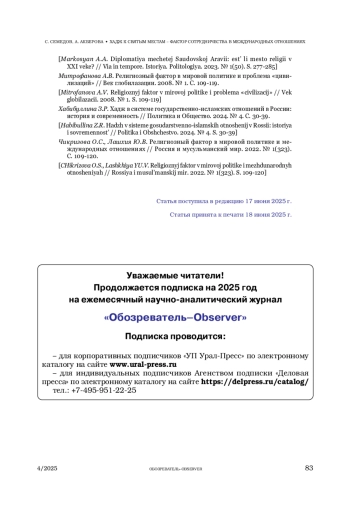 5. Хабибуллина З.Р. Хадж в системе государственно-исламских отношений в России: история и современность // Политика и Общество. 2024. № 4. С. 30-39.