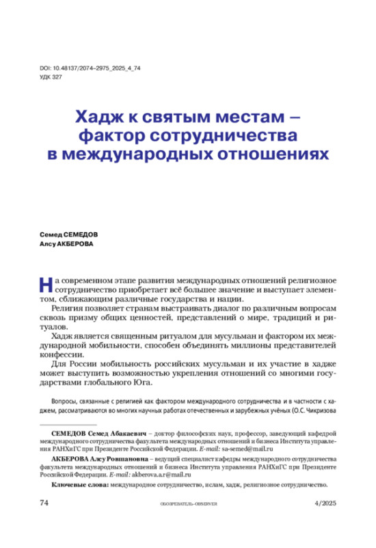 Религия выступает одним из основополагающих факторов международного сотрудничества, так как объединяет представителей разных этносов, государств, континентов, являясь для них связующим звеном. Ислам – одна из основных мировых конфессий, а хадж, будучи одним из его главных столпов, способствует мобильности мусульман и их сближению. Рассматривается роль хаджа в российской публичной дипломатии, так как мусульмане являются важной составляющей многонациональной и многоконфессиональной России.