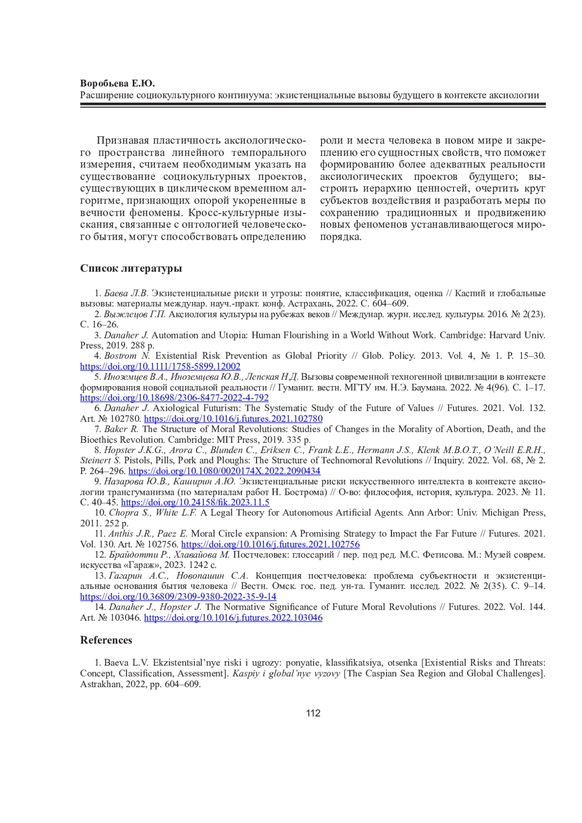 1. Баева Л.В. Экзистенциальные риски и угрозы: понятие, классификация, оценка // Каспий и глобальные вызовы: материалы междунар. науч.-практ. конф. Астрахань, 2022. С. 604-609. EDN: YDCAJC