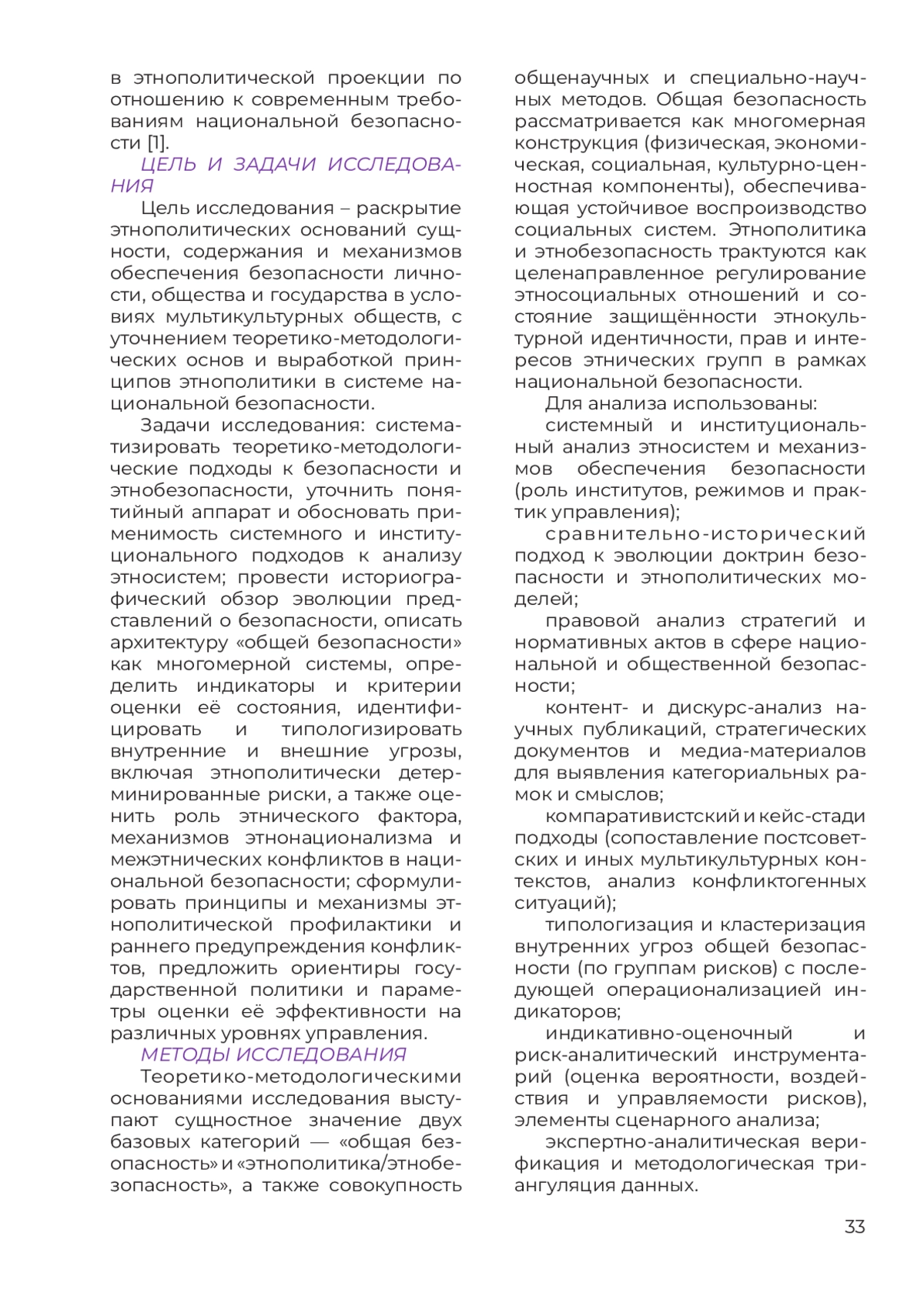 В работе представлены результаты исследования этнополитических оснований безопасности общества, государства и личности. На основе системного и институционального подходов предпринята попытка осмысления сущности, содержания и специфики этнополитического измерения безопасности в рамках общей концепции национальной безопасности. Обоснован вывод о том, что в современных мультикультурных обществах этнический фактор является базовым в достижении и удержании высокого уровня безопасности. Показано, что безопасность включает взаимосвязанные физический, экономический, социальный, культурный и ценностно-нормативный компоненты, требующие согласованной политики. Выявлены ключевые индикаторы состояния безопасности и типовые угрозы, порождаемые как внешними вызовами, так и дисфункциями институтов. Уточнены понятия этнобезопасности и этнополитики, их место в архитектуре национальной безопасности. Практическая значимость исследования состоит в формулировании принципов профилактики этнической напряжённости, механизмов раннего предупреждения конфликтов и критериев оценки эффективности управленческих решений на различных уровнях управления.