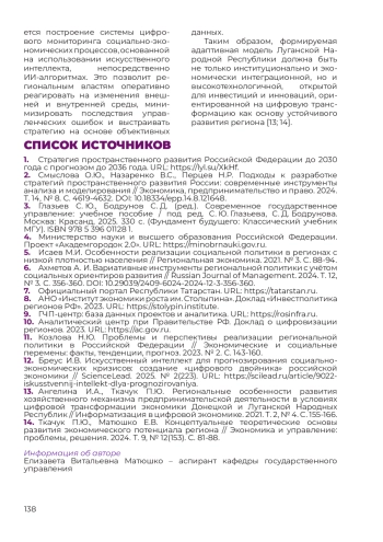 13. Ангелина И.А., Ткачук П.Ю. Региональные особенности развития хозяйственного механизма предпринимательской деятельности в условиях цифровой трансформации экономики Донецкой и Луганской Народных Республик // Информатизация в цифровой экономике. 2021. Т. 2, № 4. С. 155-166.