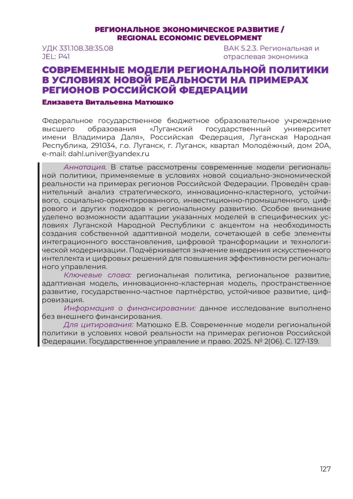 В статье рассмотрены современные модели региональной политики, применяемые в условиях новой социально-экономической реальности на примерах регионов Российской Федерации. Проведён сравнительный анализ стратегического, инновационно-кластерного, устойчивого, социально-ориентированного, инвестиционно-промышленного, цифрового и других подходов к региональному развитию. Особое внимание уделено возможности адаптации указанных моделей в специфических условиях Луганской Народной Республики с акцентом на необходимость создания собственной адаптивной модели, сочетающей в себе элементы интеграционного восстановления, цифровой трансформации и технологической модернизации. Подчёркивается значение внедрения искусственного интеллекта и цифровых решений для повышения эффективности регионального управления.