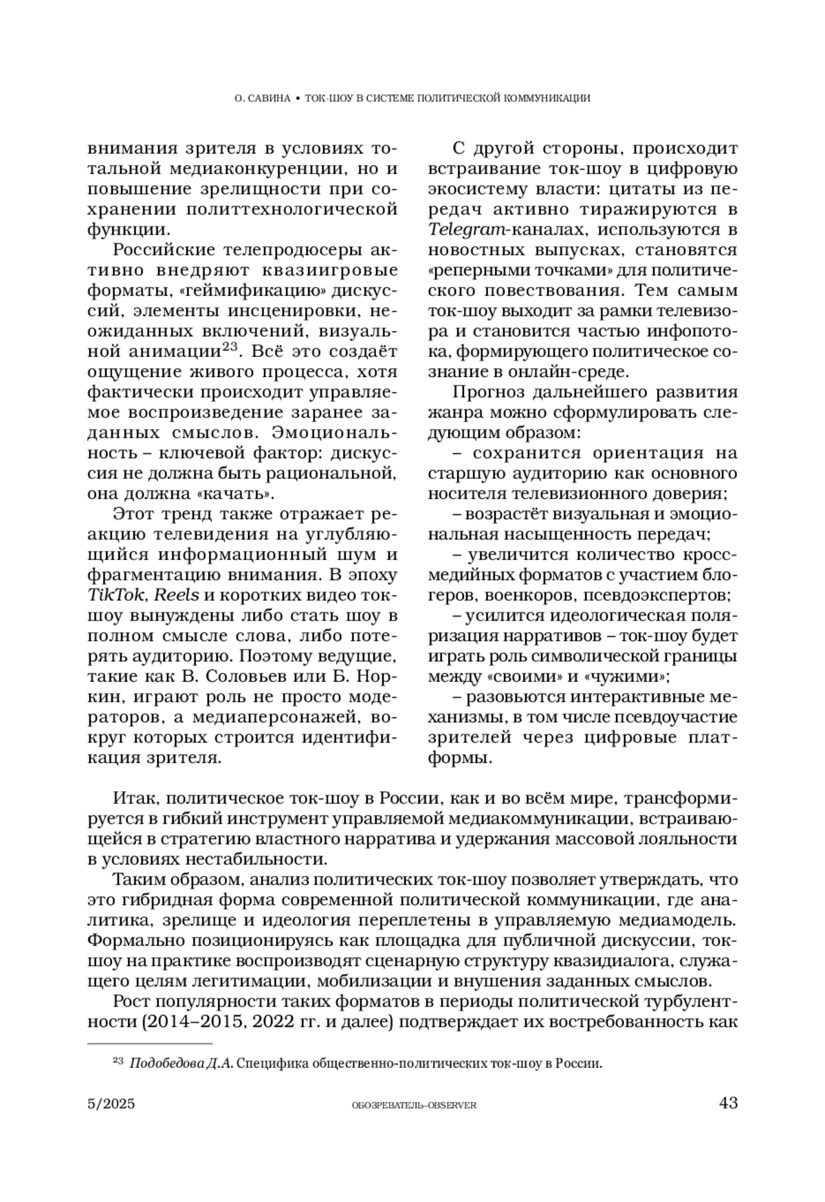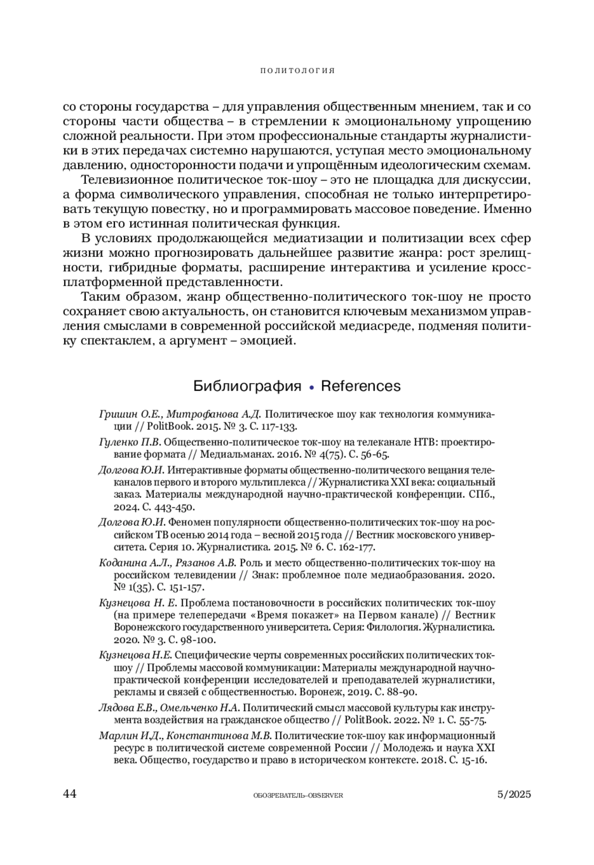 4. Долгова Ю.И. Феномен популярности общественно-политических ток-шоу на российском ТВ осенью 2014 года - весной 2015 года // Вестник московского университета. Серия 10. Журналистика. 2015. № 6. С. 162-177.