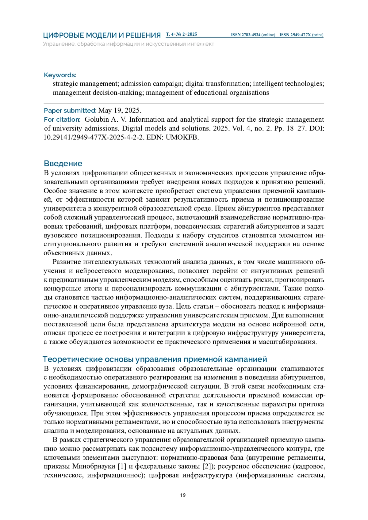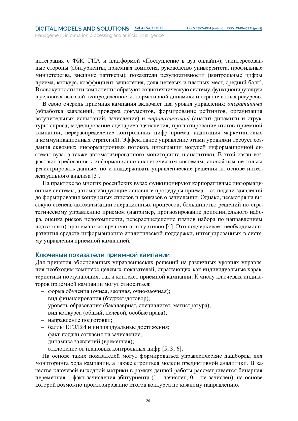 В условиях цифровизации общественных и экономических процессов управление образовательными организациями требует внедрения новых подходов к принятию решений. Особое значение в этом контексте приобретает система управления приемной кампанией, от эффективности которой зависит результативность приема и позиционирование университета в конкурентной образовательной среде. Прием абитуриентов представляет собой сложный управленческий процесс, включающий взаимодействие нормативно-правовых требований, цифровых платформ, поведенческих стратегий абитуриентов и задач вузовского позиционирования. Подходы к набору студентов становятся элементом институционального развития и требуют системной аналитической поддержки на основе объективных данных