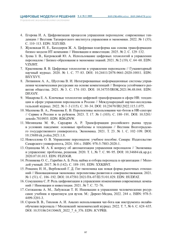 4. Егорова И. А. Цифровизация процессов управления персоналом: современные тенденции // Вестник Таганрогского института управления и экономики. 2022. № 1 (35). С. 110-113. EDN: XIZUBD