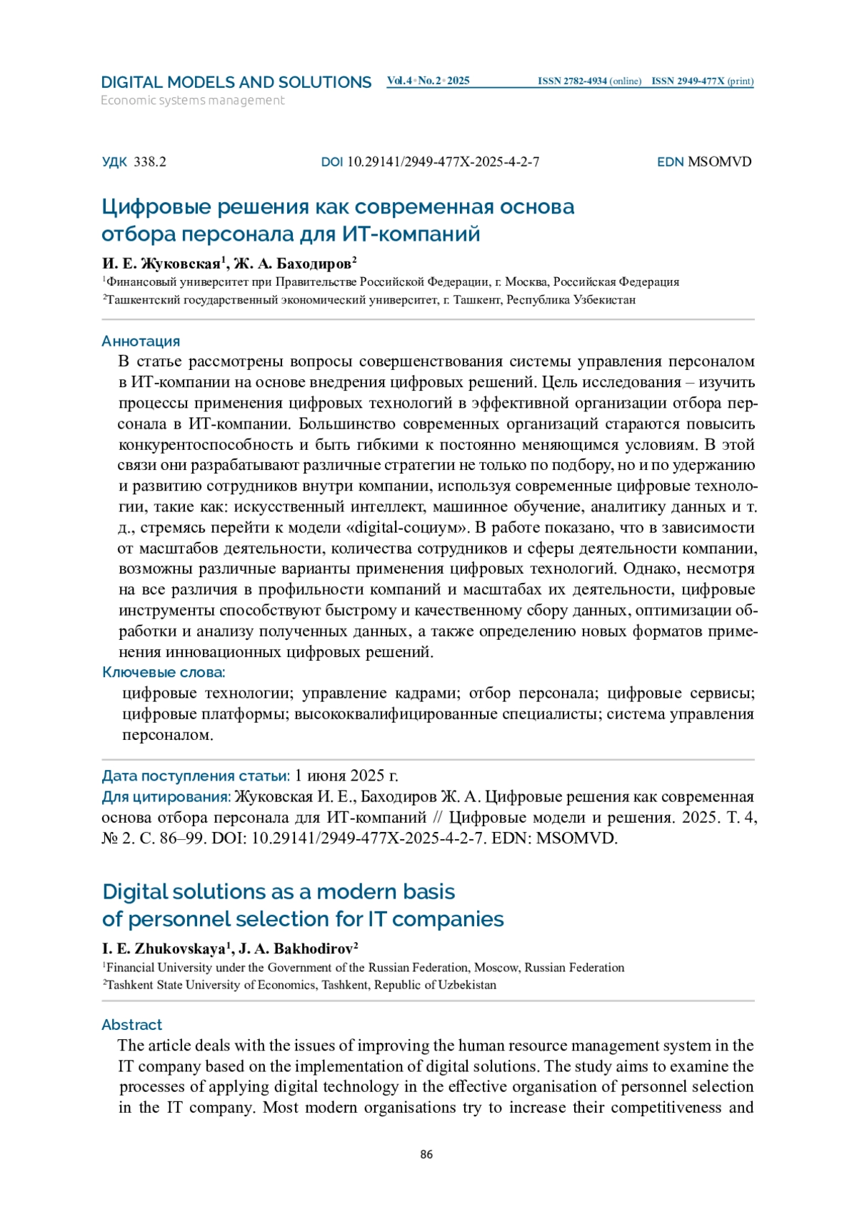 5. Жуковская И. Е., Баходиров Ж. А. Цифровая платформа как основа трансформации бизнес-модели ИТ-компании // Инновации и инвестиции. 2025. № 2. С. 129-132. EDN: GZGFKN