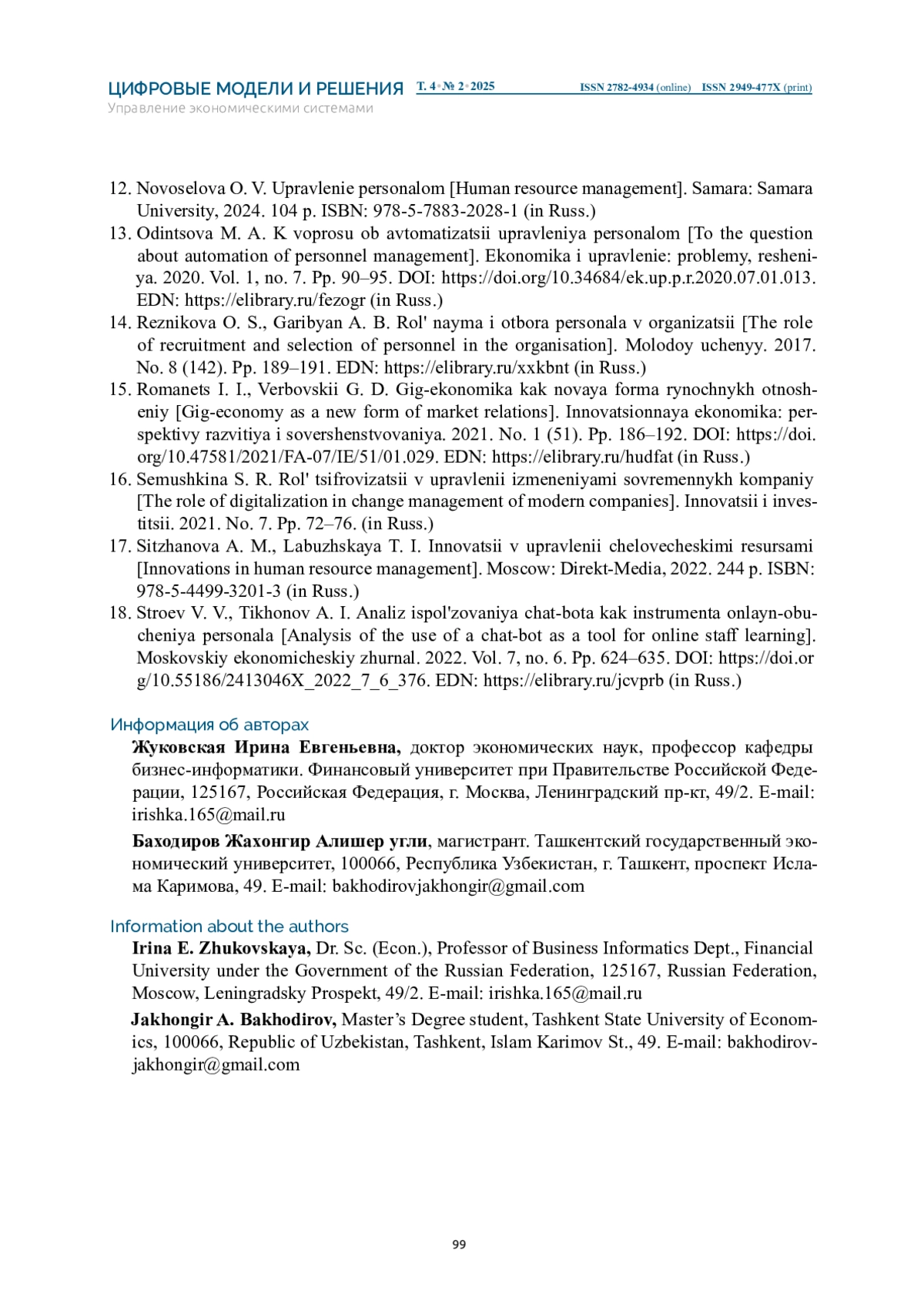 10. Малекова В. А., Романова Е. В. Перспективы использования чат-ботов в HR-секторе // Сервис в России и за рубежом. 2023. Т. 17. № 1 (103). С. 180-191. 10.5281/ zenodo.7810955. DOI: 10.5281/zenodo.7810955 EDN: RDGZNW
