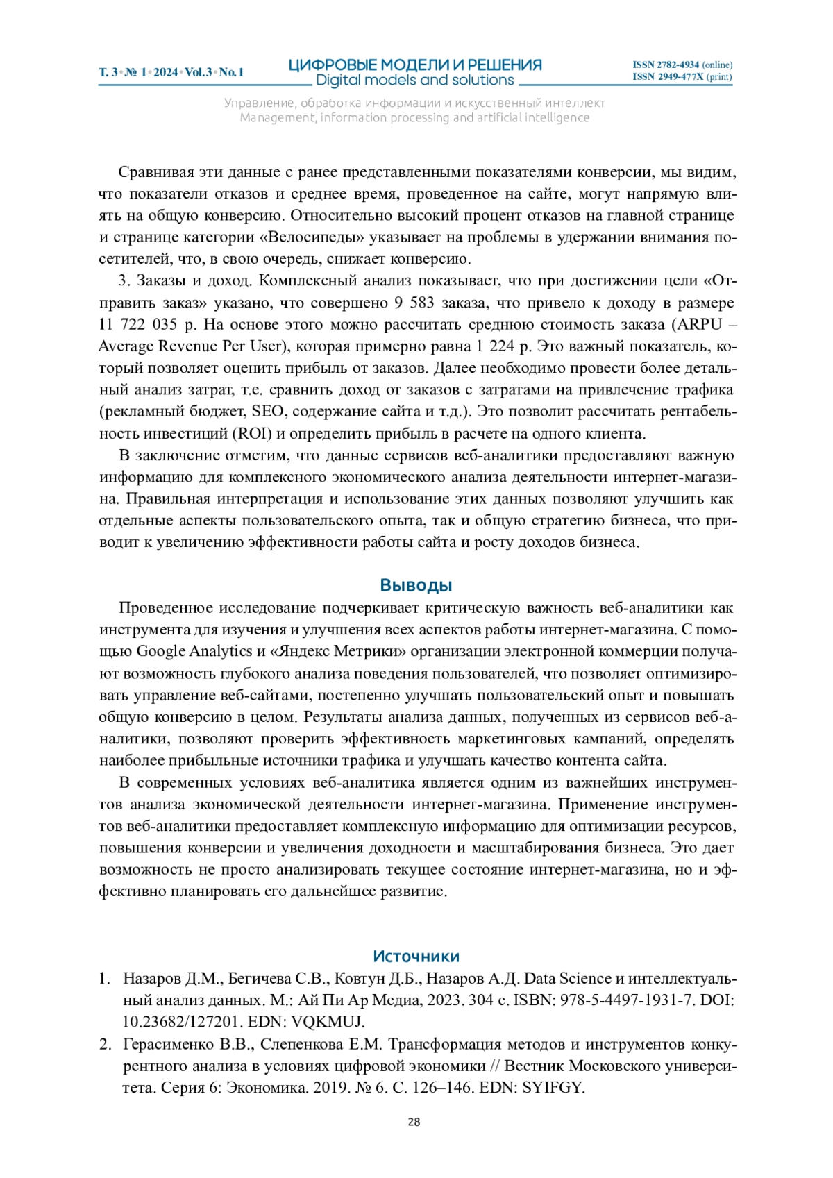 Современный рынок электронной коммерции представляет собой экономическую среду с высоким уровнем конкуренции, поэтому достижение коммерческого успеха на нем во многом зависит от способности торговых организаций анализировать и оптимизировать свою деятельность на основе данных, представляемых сервисами веб-аналитики. В статье освещается значимость веб-аналитики для оценки и улучшения работы интернет-магазина. Рассматриваются возможности, предоставляемые двумя ведущими инструментами в этой области: Google Analytics и «Яндекс Метрика». Основное внимание уделено анализу конверсии, пониманию целевой аудитории и оптимизации маркетинговых усилий. В статье предлагается комплексный подход к использованию веб-аналитики для повышения экономической эффективности и обеспечения устойчивого роста показателей экономической деятельности интернет-магазина