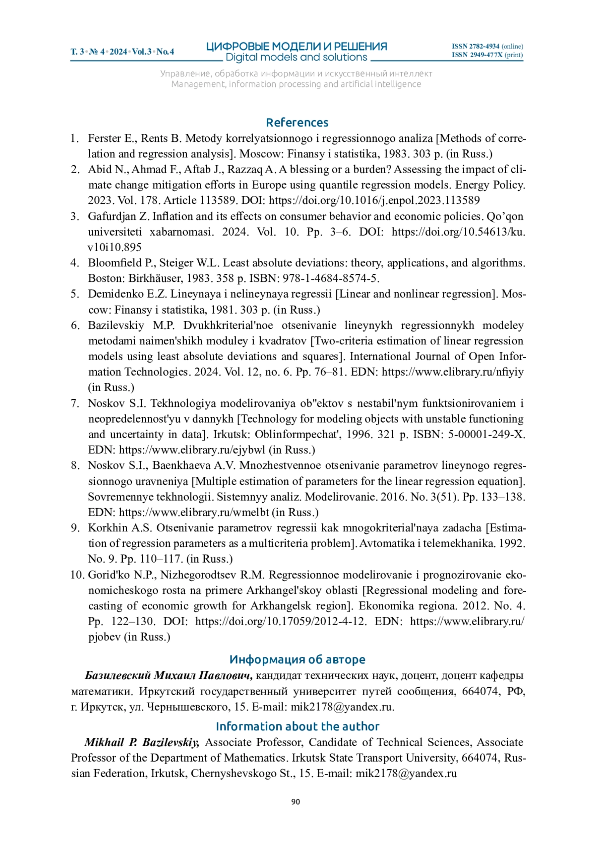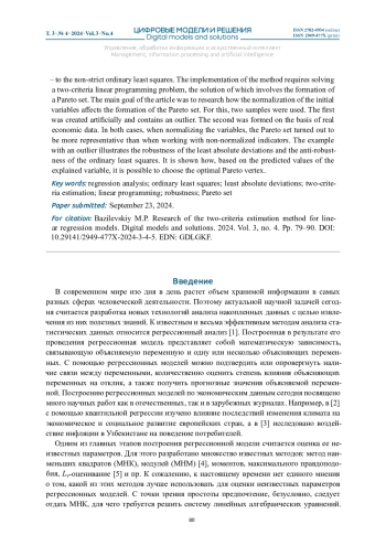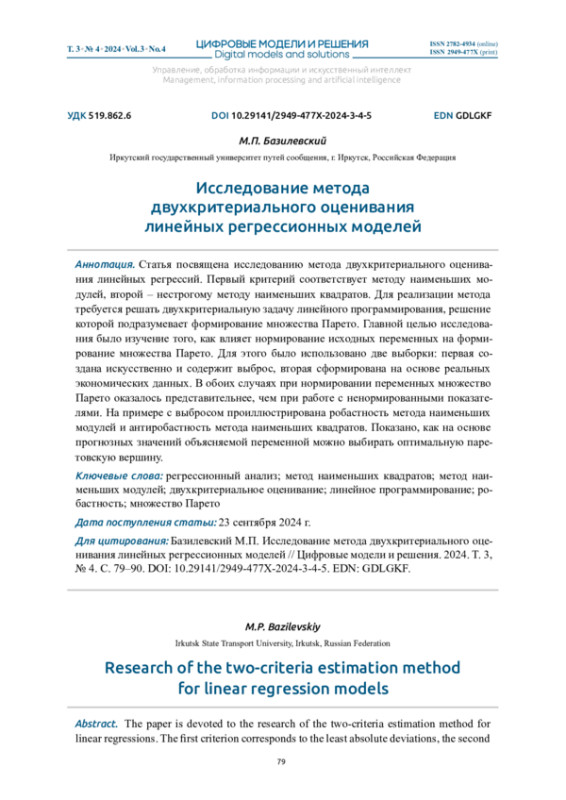 6. Базилевский М.П. Двухкритериальное оценивание линейных регрессионных моделей методами наименьших модулей и квадратов // International Journal of Open Information Technologies. 2024. Т. 12, № 6. С. 76-81. EDN: NFIYIY