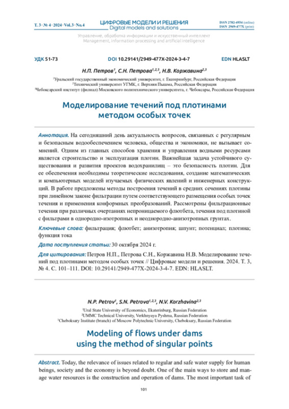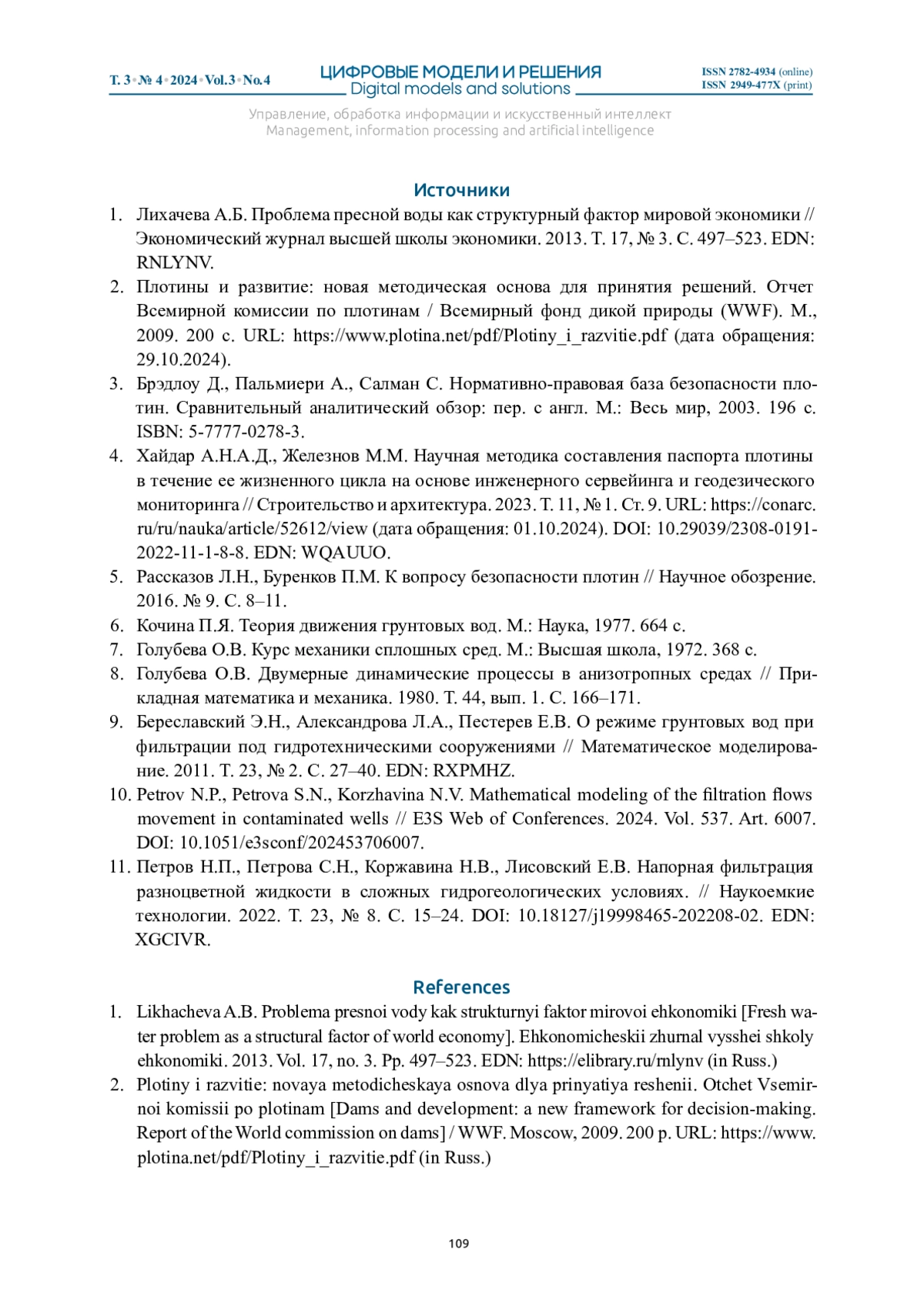 10. Petrov N.P., Petrova S.N., Korzhavina N.V. Mathematical modeling of the filtration flows movement in contaminated wells // E3S Web of Conferences. 2024. Vol. 537. Art. 6007. DOI: 10.1051/e3sconf/202453706007 EDN: CPBNNF