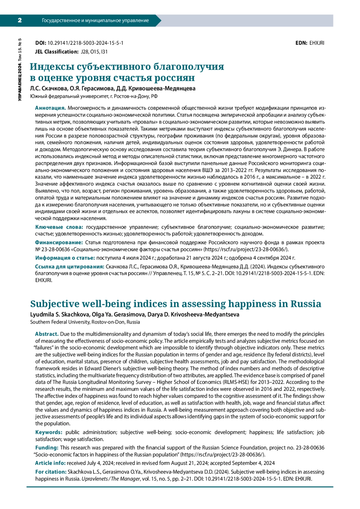 8. Скачкова Л.С., Герасимова О.Я., Кривошеева-Медянцева Д.Д., Яковлева Е.А. (2023). Экономика счастья: исследование об исследованиях // Журнал институциональных исследований. Т. 15, № 3. С. 125-146. DOI: 10.17835/2076-6297.2023.15.3.125-146 EDN: HPVWUD