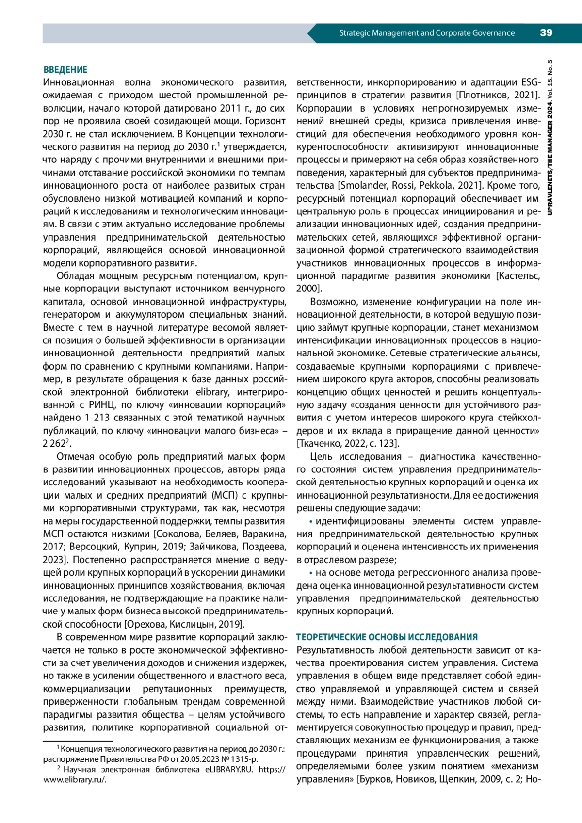 Инновационная волна экономического развития, ожидаемая с приходом шестой промышленной революции, начало которой датировано 2011 г., до сих пор не проявила своей созидающей мощи. Горизонт 2030 г. не стал исключением. В Концепции технологического развития на период до 2030 г.1 утверждается, что наряду с прочими внутренними и внешними причинами отставание российской экономики по темпам инновационного роста от наиболее развитых стран обусловлено низкой мотивацией компаний и корпораций к исследованиям и технологическим инновациям. В связи с этим актуально исследование проблемы управления предпринимательской деятельностью корпораций, являющейся основой инновационной модели корпоративного развития.