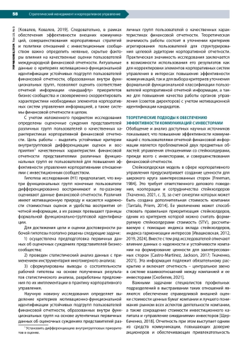 Внешние коммуникации являются важной составляющей корпоративных систем управления информацией [Телегин, 2022; Щербаченко, 2018], опосредующей взаимоотношения с инвесторами, бизнес-партнерами, кредиторами, саморегулируемыми организациями и другими лицами, как зависящими от решений и действий компании, так и оказывающими влияние на ее решения и действия, то есть заинтересованными сторонами (стейкхолдерами)1 [Freeman, 1984, р. 58]. Поиск общего консенсуса и задачу выстраивания конструктивного диалога с наиболее весомыми для публичных компаний стейкхолдерами, прежде всего инвесторами, существенно усложняют вариативность и объемность этой аудитории.