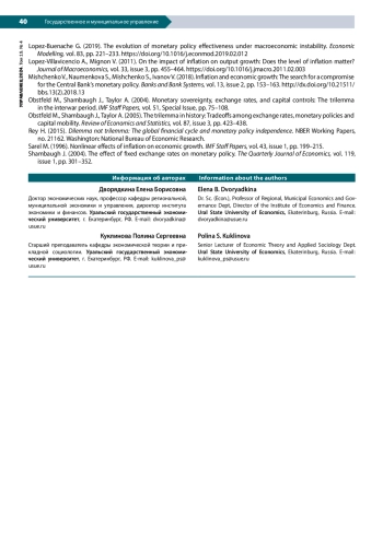 2. Андрюшин С.А. (2014). Перспективы режима таргетирования инфляции в России // Вопросы экономики. № 11. С. 107-121. Андрюшин С.А. (2015). Аргументы в пользу управления обменным курсом рубля // Вопросы экономики. № 12. С. 51-68. EDN: UXMGOT