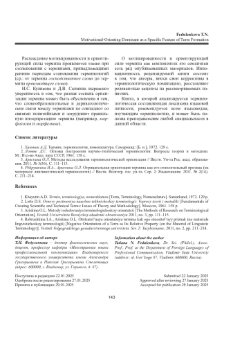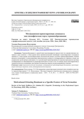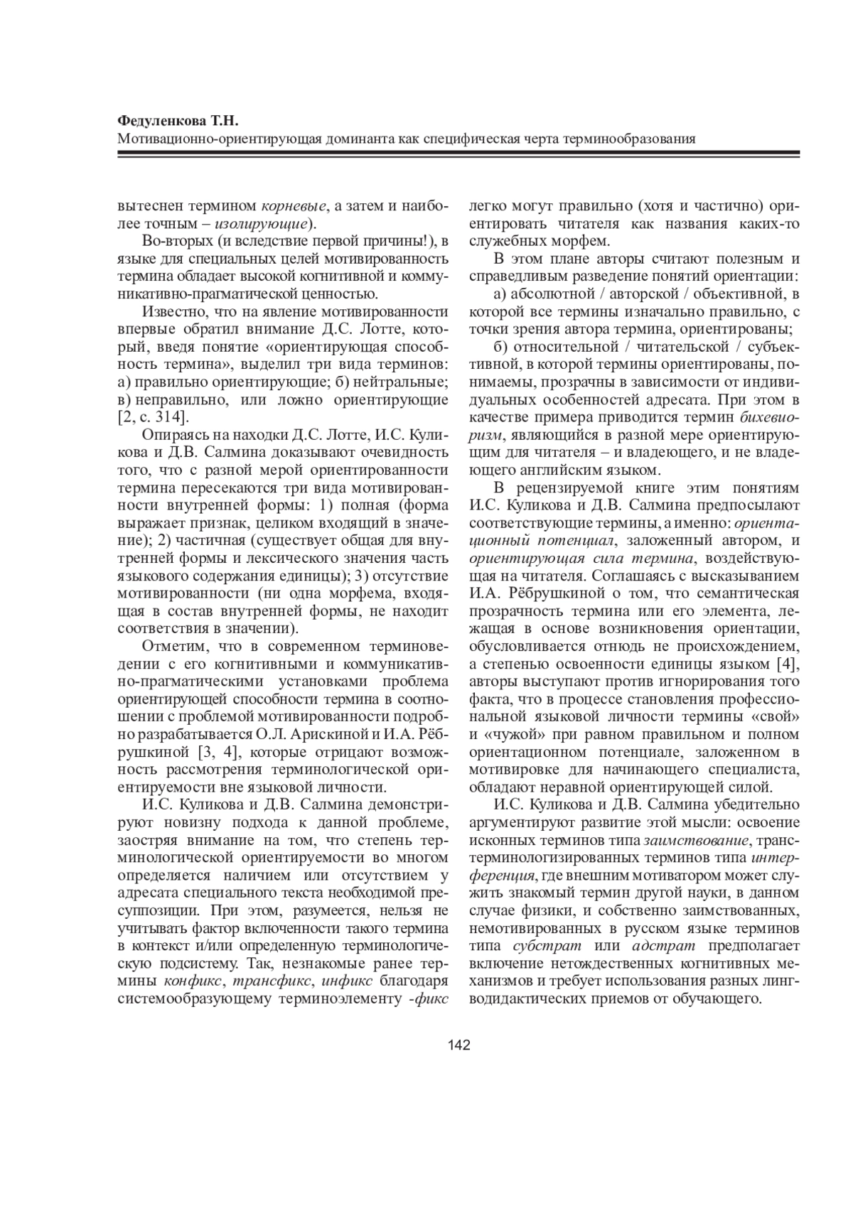 Видное место в своей книге И. С. Куликова и Д. В. Салмина отводят рассмотрению такого понятия, как мотивационно-ориентирующая доминанта терминообразования. Еще полвека назад отмечалось, что термины, в отличие от спонтанного процесса словообразования в общем языке, не образуются, а создаются [1, с. 55]. Указывая на интеграцию, дифференциацию, унификацию как специфические тенденции терминологической динамики, обу- словленные именно целенаправленностью их создания, авторы утверждают, что в конечном счете эти тенденции направлены на совершенствование терминосистем и их коммуникативно-когнитивного потенциала.