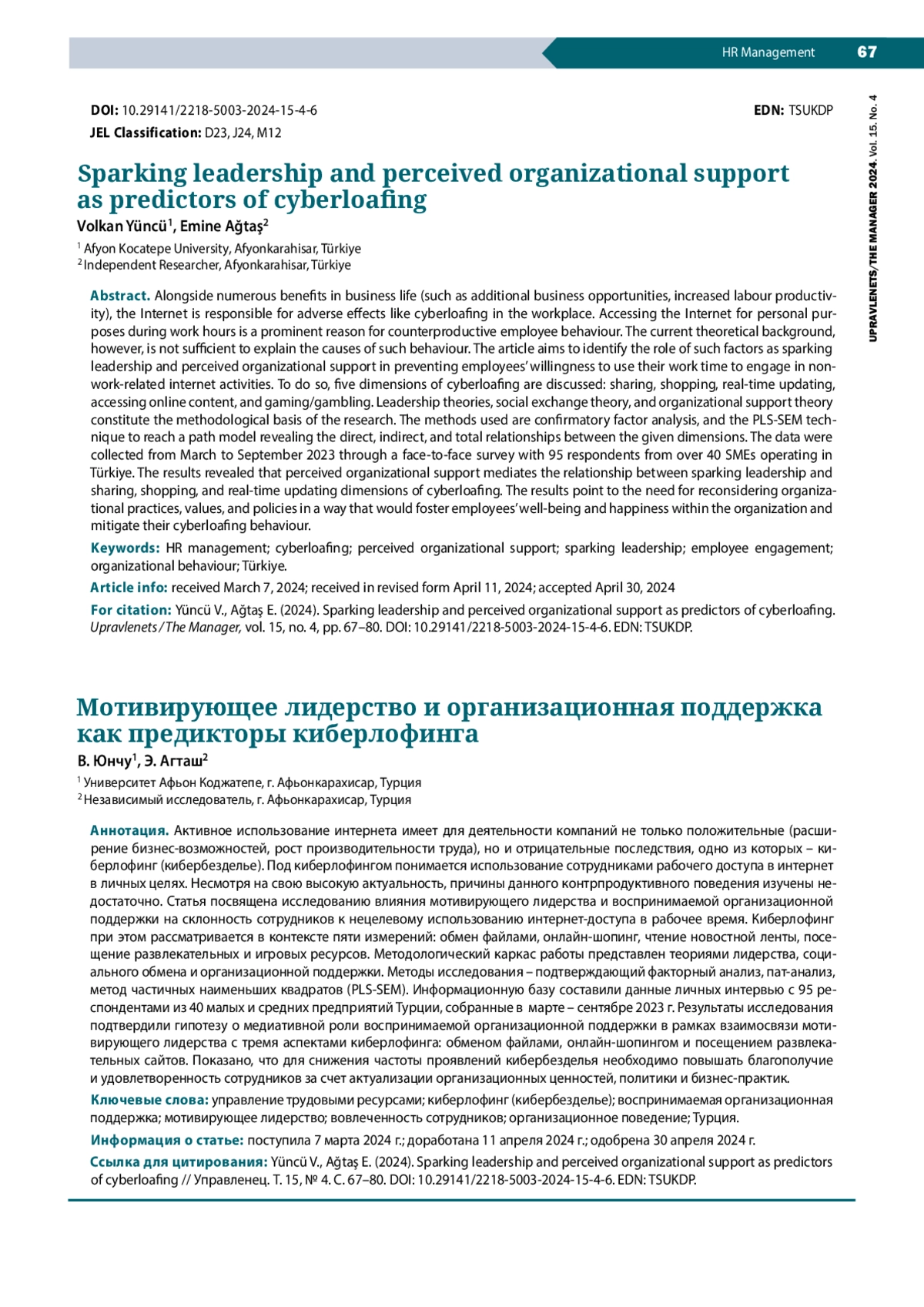 Alongside numerous benefits in business life (such as additional business opportunities, increased labour productivity), the Internet is responsible for adverse effects like cyberloafing in the workplace. Accessing the Internet for personal purposes during work hours is a prominent reason for counterproductive employee behaviour. The current theoretical background, however, is not sufficient to explain the causes of such behaviour. The article aims to identify the role of such factors as sparking leadership and perceived organizational support in preventing employees’ willingness to use their work time to engage in nonwork-related internet activities. To do so, five dimensions of cyberloafing are discussed: sharing, shopping, real-time updating, accessing online content, and gaming/gambling. Leadership theories, social exchange theory, and organizational support theory constitute the methodological basis of the research. The methods used are confirmatory factor analysis, and the PLS-SEM technique to reach a path model revealing the direct, indirect, and total relationships between the given dimensions. The data were collected from March to September 2023 through a face-to-face survey with 95 respondents from over 40 SMEs operating in Türkiye. The results revealed that perceived organizational support mediates the relationship between sparking leadership and sharing, shopping, and real-time updating dimensions of cyberloafing. The results point to the need for reconsidering organizational practices, values, and policies in a way that would foster employees’ well-being and happiness within the organization and mitigate their cyberloafing behaviour