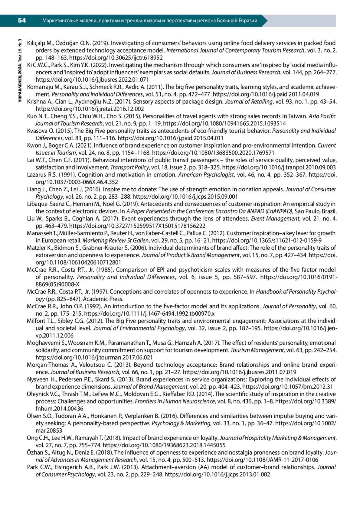1. Aaker J.L. (1997). Dimensions of brand personality. Journal of Marketing Research, vol. 34, no. 3, pp. 347-356. DOI: 10.2307/3151897 EDN: CORYRP