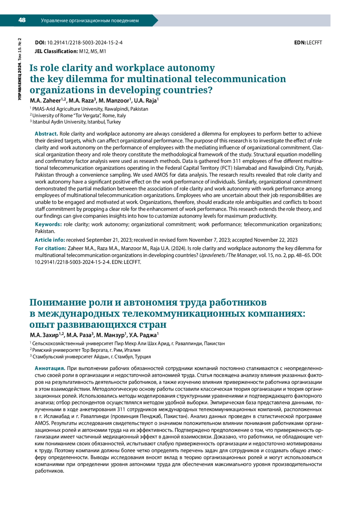 In the context of globalization, work autonomy as well as an individual global mindset helps employees seek competitive advantage, thereby enhancing work performance and innovative work behaviour [Correia et al., 2023; Pusparini, Aryasa, 2021; van Zyl et al., 2021]. Employees who believe that the outcome is the product of their actions and have good relationships with their leaders are seen to have a considerably greater level of role clarity, which has a substantial influence on work performance and commitment than those who lack all of these aspects [Hegazy et al., 2023; Kauppila, 2014].
