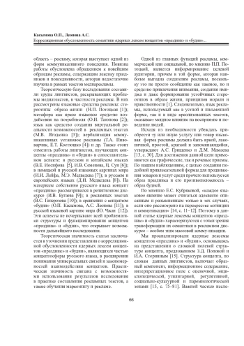 Целью статьи является системное описание ядерных лексем концептов «праздник» и «будни» на материале рекламных микротекстов, которые ранее не рассматривались в данном аспекте. Сравнительный лингвистический анализ значения и функционирования ядерных лексем позволил определить общее и специфическое в их семантической структуре. Объектом исследования стали тексты современных медиареклам, где используются указанные концепты, предметом - ядерные лексемы, без обращения к их периферии - синонимам, фразеологическим единицам и ассоциатам. Материал был отобран методом сплошной выборки из региональных объявлений и видеороликов последних лет. В ходе работы использовались методы компонентного, корреляционного и контекстного анализа, корпусный метод. Общая функция рассматриваемых концептов в анализируемых рекламных текстах заключается в продвижении товаров и услуг. Слово «праздник» означает нерабочий день, а также счастливый, радостный день, в котором происходят важные, приятные события. Слово «будни» имеет противоположное значение: это монотонная, повседневная, обыденная жизнь. В контексте рекламы слово «праздник» кроме основного значения приобретает добавочное: это товар, который покупается, организуется, праздником называют скидки, разные важные события в жизни. Слово «будни», в свою очередь, не развивает добавочного значения. Оно обладает меньшими функциональными возможностями в сравнении со словом «праздник», выступая в роли триггера, призванного вызывать противоположные празднику ассоциации, т. е. используется для подчеркивания контраста со словом «праздник» или синонимичными ему словами.