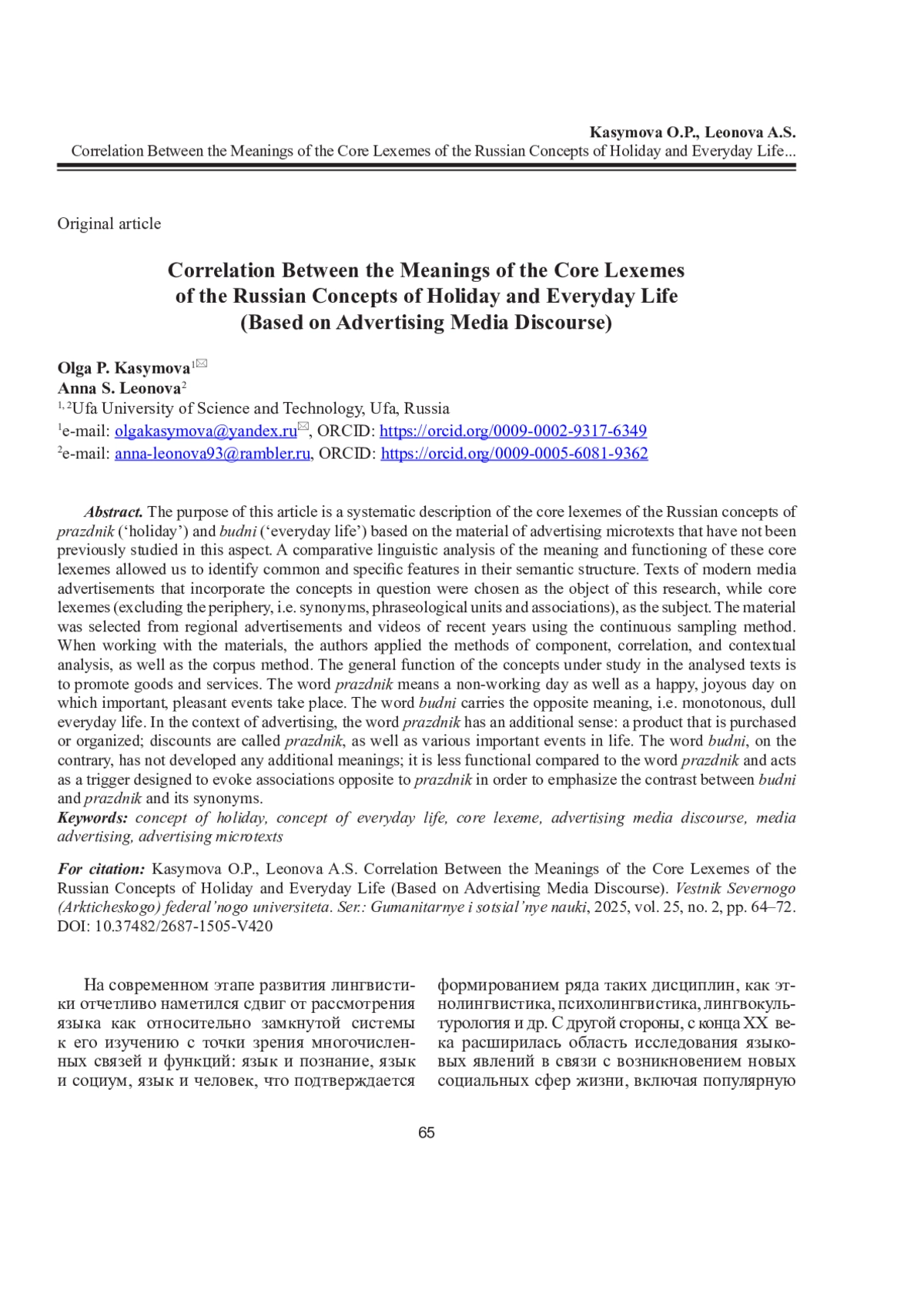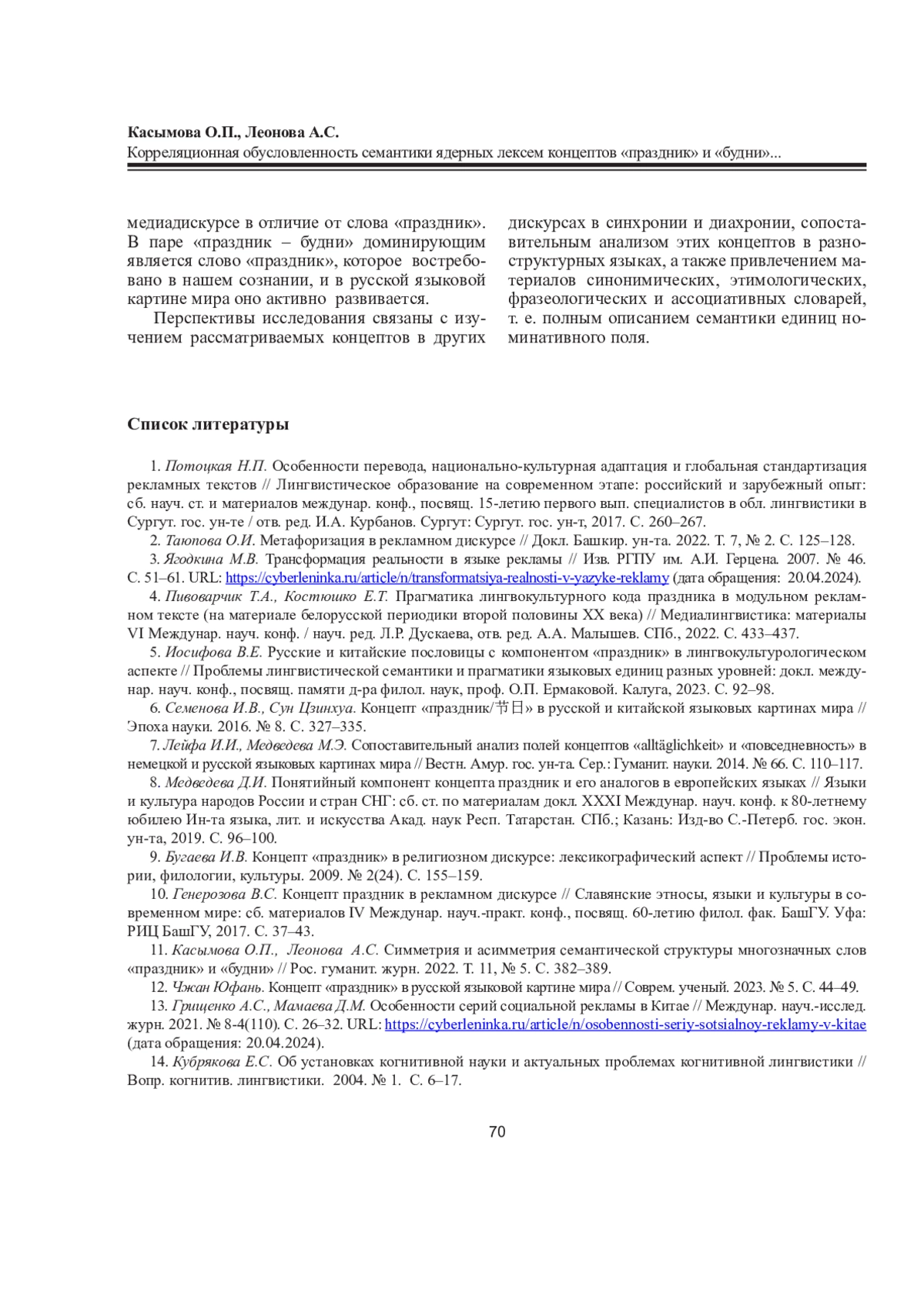 11. Касымова О.П., Леонова А.С. Симметрия и асимметрия семантической структуры многозначных слов “праздник” и “будни” // Рос. гуманит. журн. 2022. Т. 11, No 5. С. 382-389. EDN: DLCCFN
