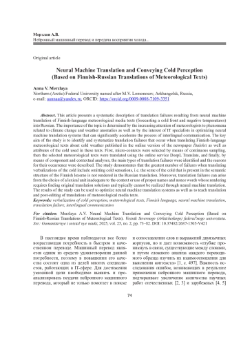 В данной статье представлено системное описание переводческих неудач, возникающих в результате нейронного машинного перевода на русский язык финноязычных метеорологических медиатекстов, содержащих прогнозы прохождения холодного фронта и фиксацию отрицательных температур. Актуальность темы обусловлена все более пристальным вниманием метеорологов к явлениям, связанным с изменением климата и погодными аномалиями, а также заинтересованностью специалистов IT-сферы в оптимизации систем нейронного машинного перевода, позволяющих существенно ускорить процесс межъязыковой коммуникации. Основная цель исследования состоит в выявлении и систематизации переводческих неудач, возникающих при переводе финноязычных метеотекстов о холодной погоде, которые опубликованы в электронной версии газеты «Iltalehti», и содержащихся в них признаках холода. Сначала методом сплошной выборки был проведен отбор микроконтекстов, затем посредством онлайн-переводчика DeepL Translate выполнен перевод отобранных метеотекстов, наконец, с помощью компонентного и контекстуального анализа выявлены и представлены основные типы переводческих неудач, рассмотрены причины их возникновения. Исследование показало, что наибольшее количество переводческих неудач при передаче средств вербализации холода связано с утратой ощущения холода, когда сема холода, включенная в семантическую структуру финской лексемы, не находит отражения в переводе на русский язык. Переводческие неудачи также могут быть связаны с выбором не соответствующей контексту лексической единицы, с использованием имен собственных и лингвокреатем, передача которых требует поиска оригинальных переводческих решений и чаще всего не может быть реализована при нейронном машинном переводе. Результаты исследования могут быть использованы в целях оптимизации систем нейронного машинного перевода. Возможно также применение полученных данных при обучении переводу и постредактированию переводов метеорологических медиатекстов.